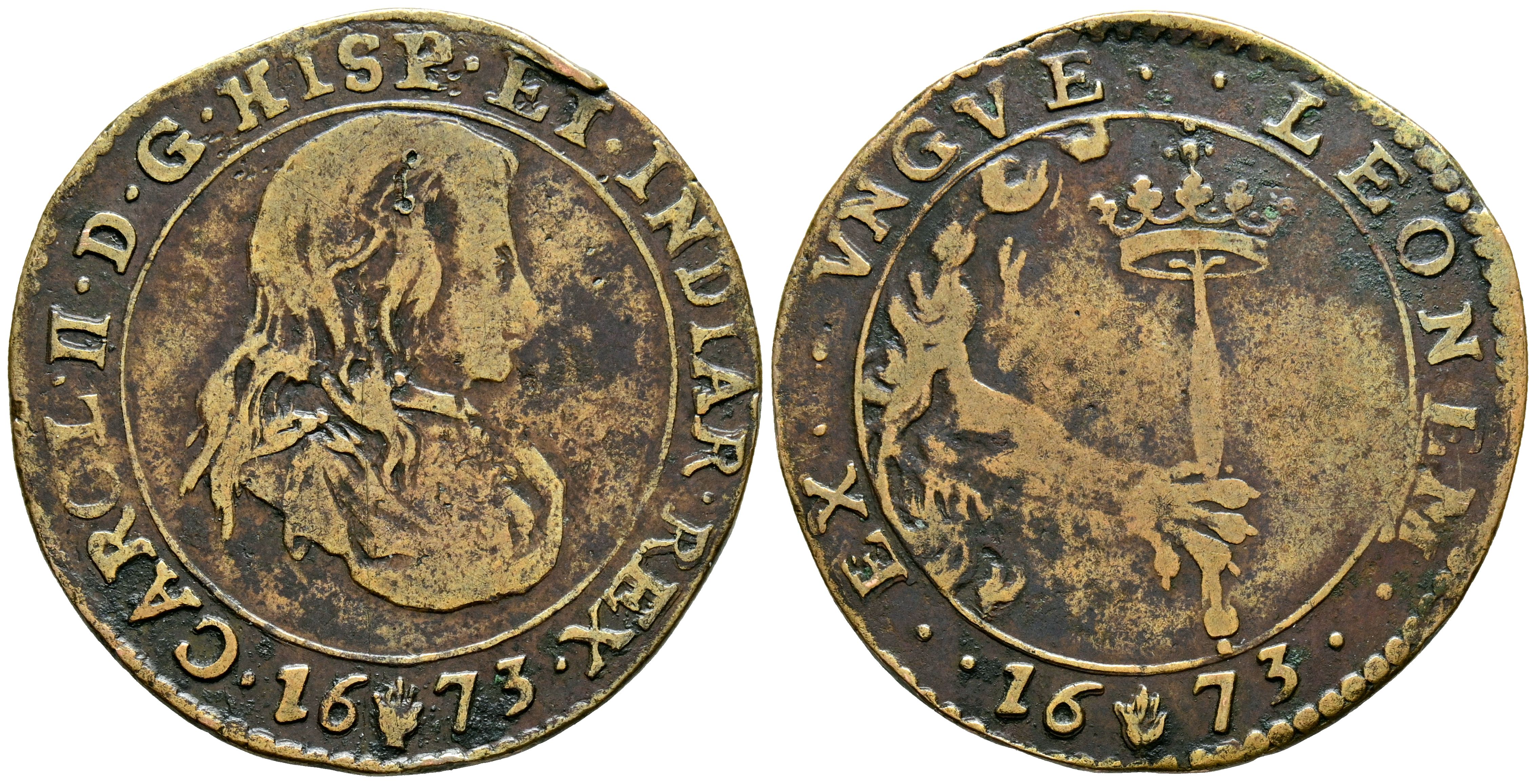 CARLOS II (1665-1700). Jetón. (Ae. 6,41g/32mm). 1673. Amberes. Tesorería desconocida. Declaración de guerra a Francia. (Dugniolle 4311). MBC-.