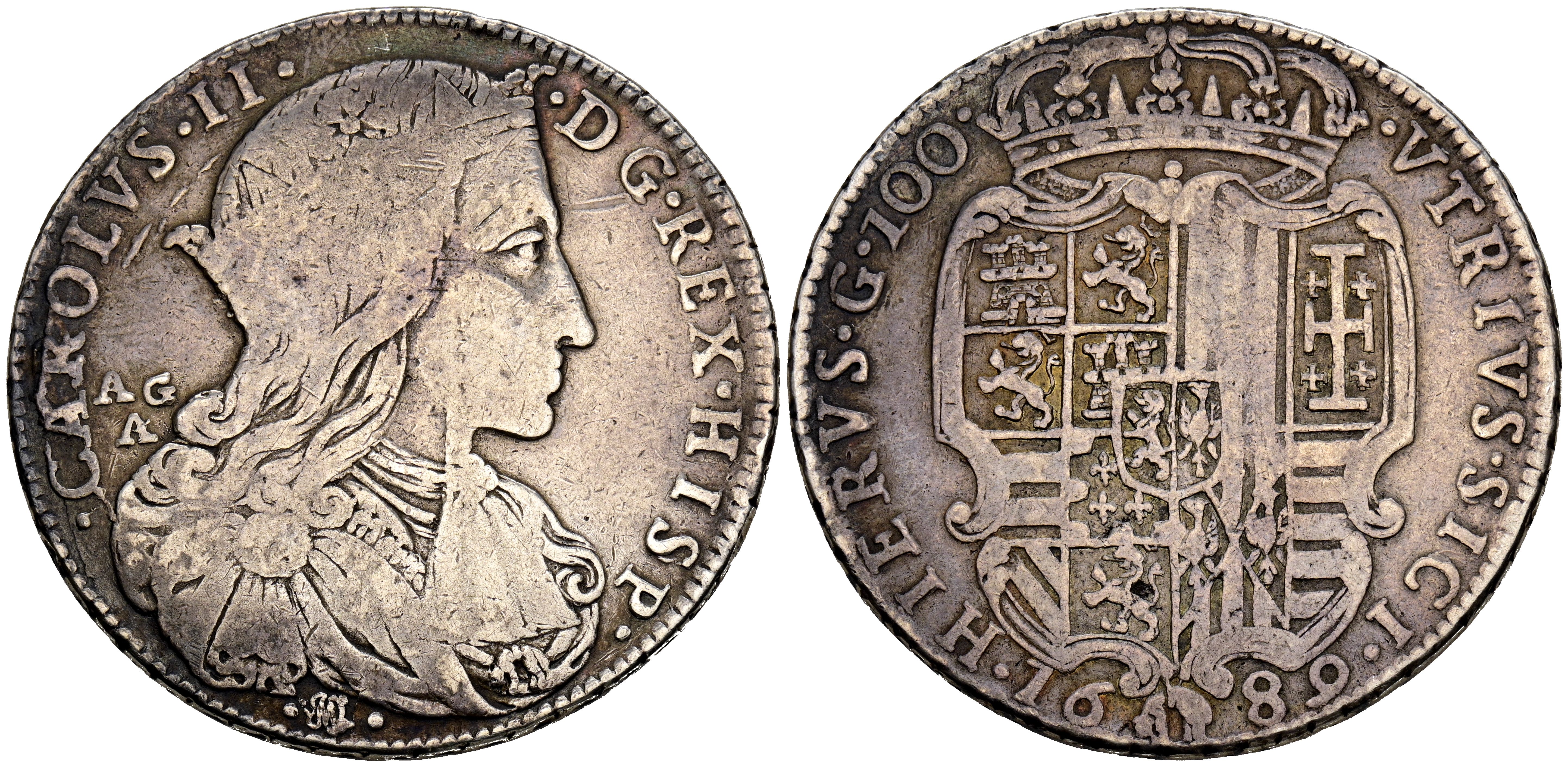 CARLOS II (1665-1700). 100 Grana. (Ar. 24,70g/41mm). 1689. Nápoles AG/A. (Vicenti 192). MBC-. Escasa.