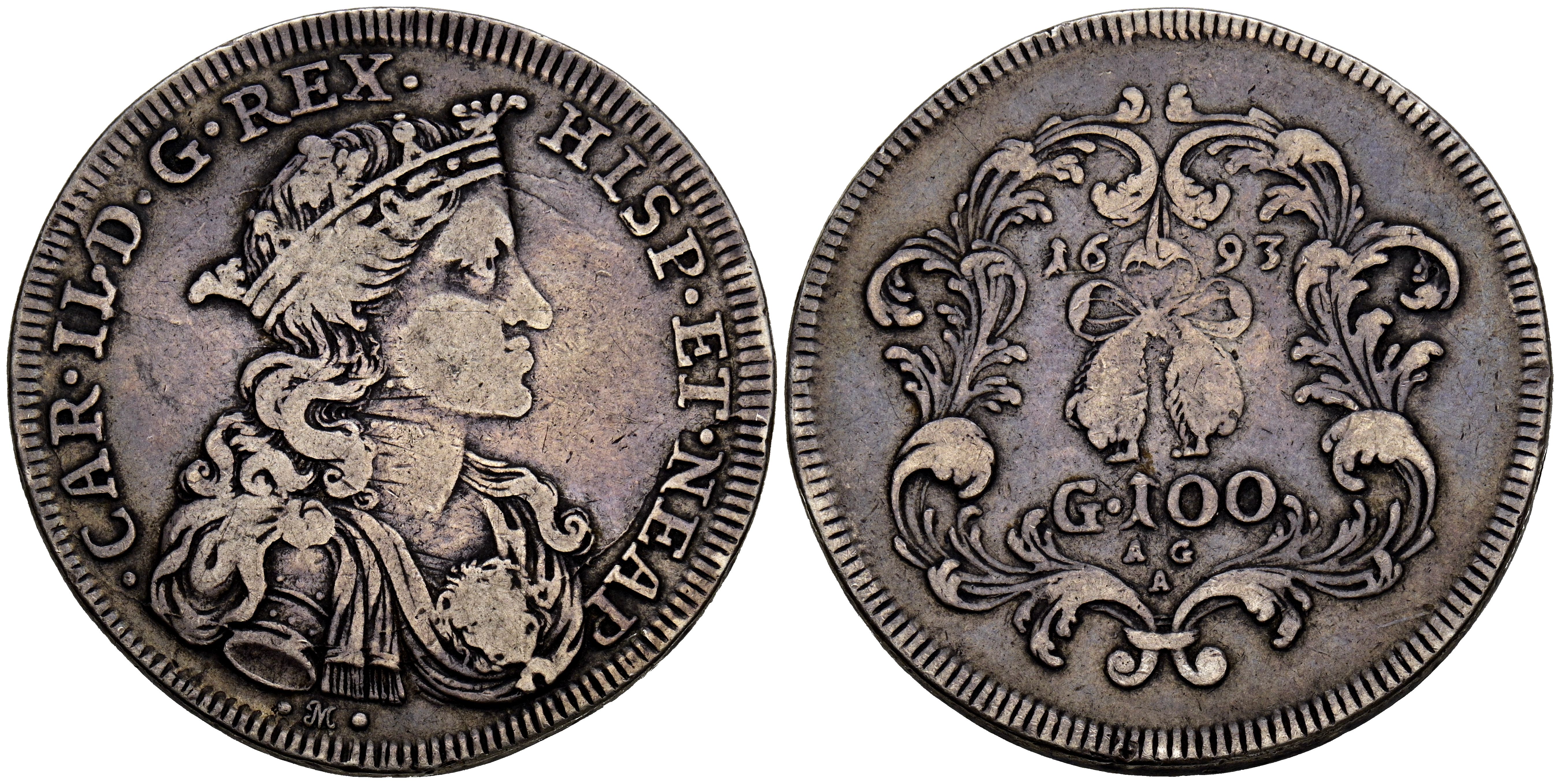CARLOS II (1665-1700). 100 Grana. (Ar. 21,41g/38mm). 1693. Nápoles AG/A. (Vicenti 194). MBC-. Escaso.