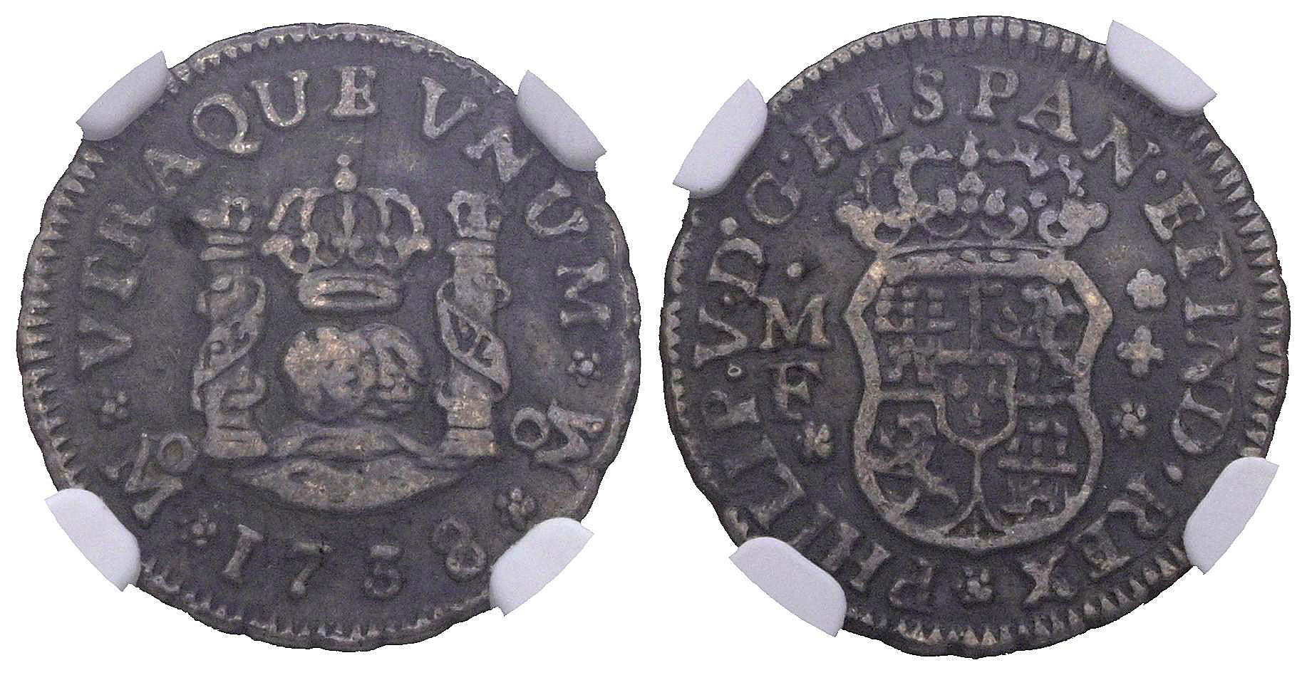 FELIPE V (1700-1746). 1/2 Real. (Ar. 1,75g/16mm)*. 1738. México MF. (Cal-2019-261). Encapsulado por NGC XF Details, Environmental Damage. *Peso y medida teóricos.