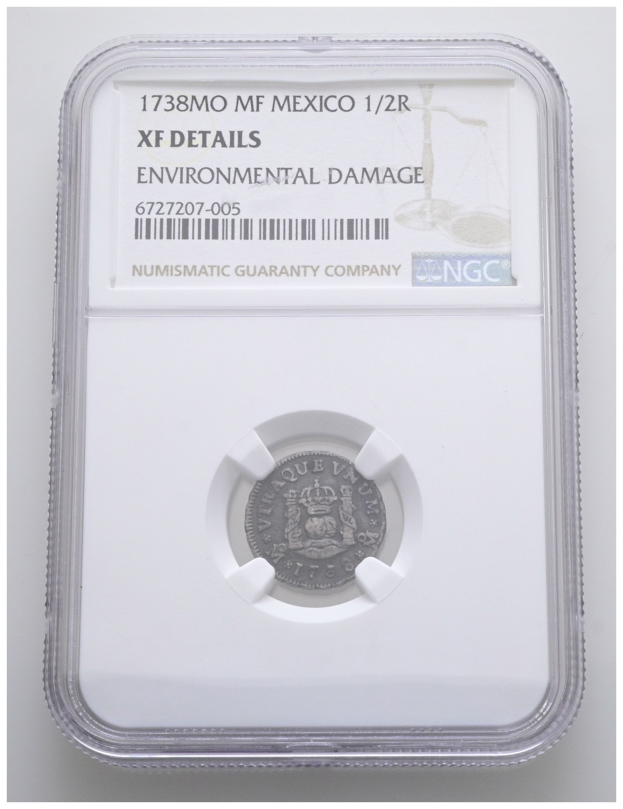 FELIPE V (1700-1746). 1/2 Real. (Ar. 1,75g/16mm)*. 1738. México MF. (Cal-2019-261). Encapsulado por NGC XF Details, Environmental Damage. *Peso y medida teóricos.