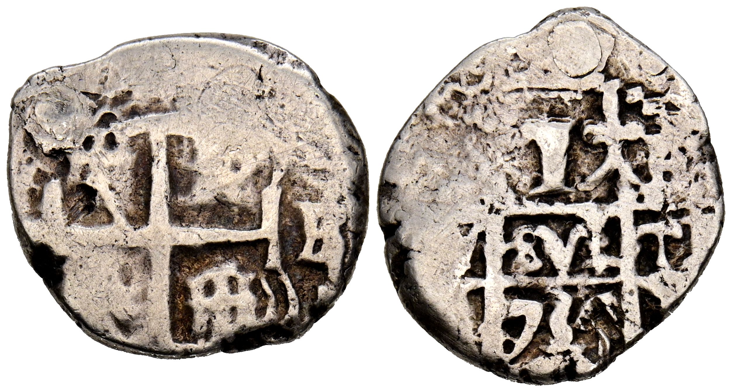 FELIPE V (1700-1746). 1 Real. (Ar. 3,49g/17mm). 1734. Potosí E. (Cal-2019-594). Doble ensayador. BC. Perforación reparada.