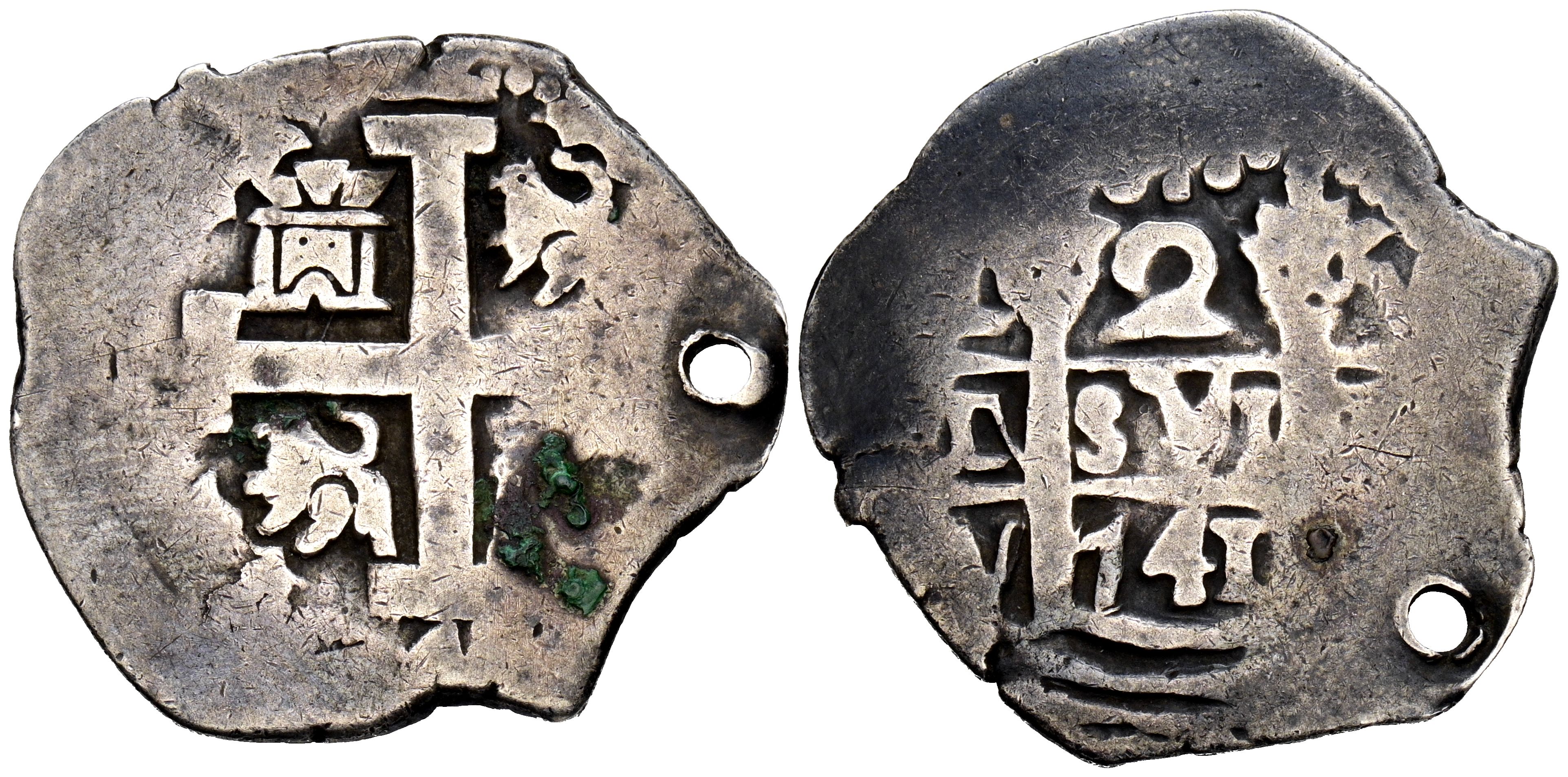 FELIPE V (1700-1746). 2 Reales. (Ar. 5,83g/27mm). 1741. Lima V. (Cal-2019-755). BC+. Perforación. Verdín en anverso.