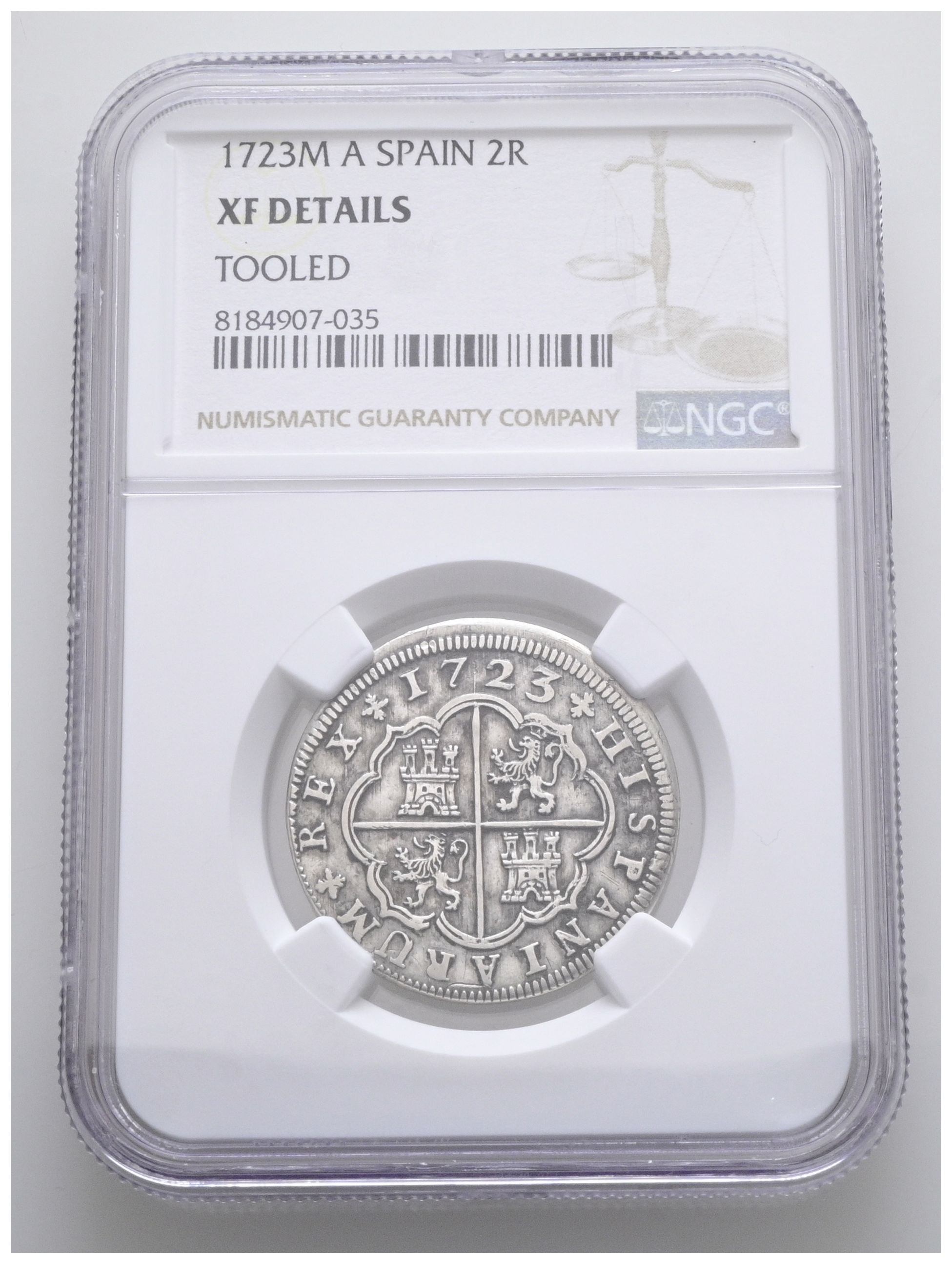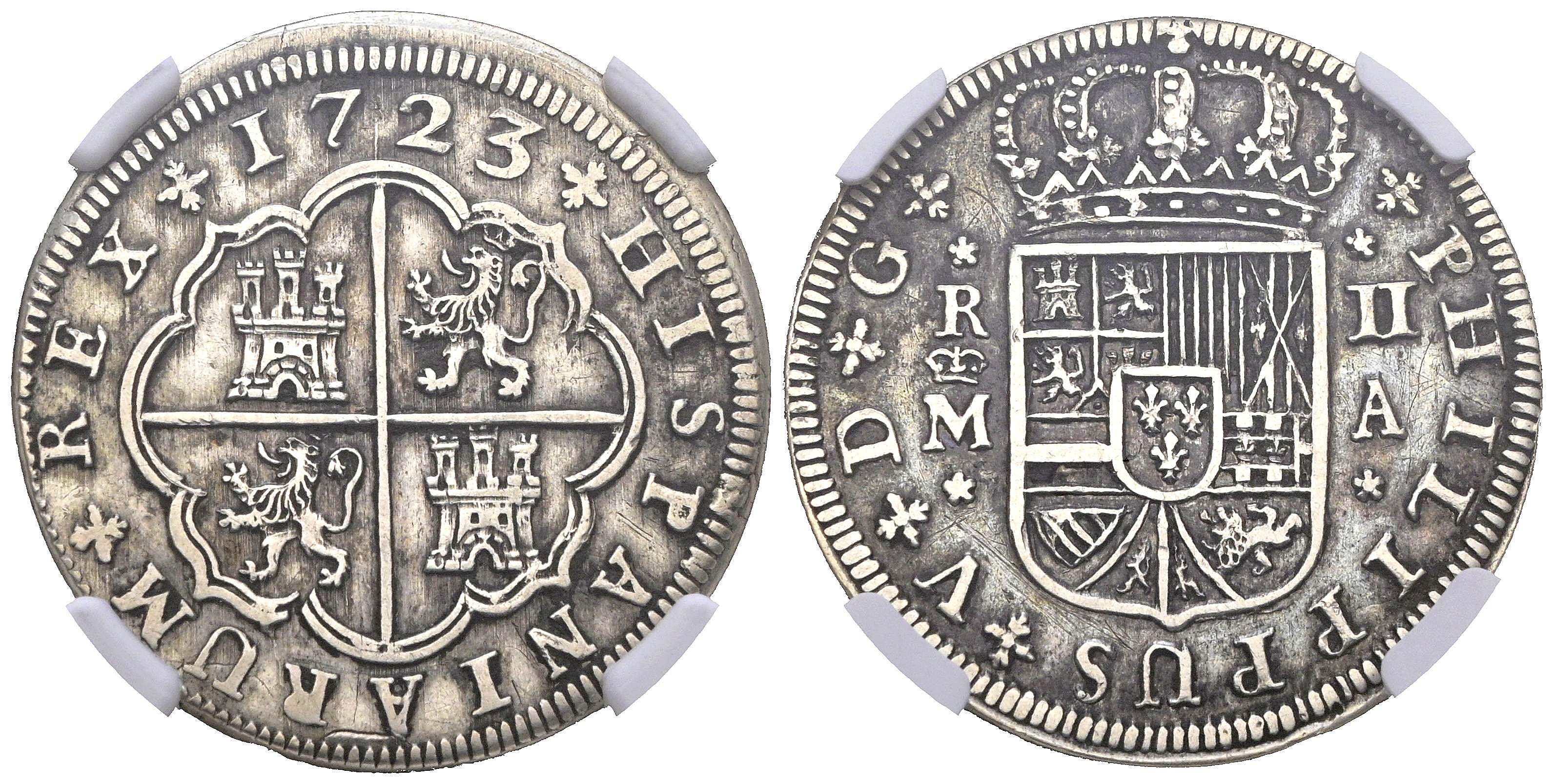 FELIPE V (1700-1746). 2 Reales. (Ar. 6,00g/26mm)*. 1723. Madrid A. (Cal-2019-777). Encapsulada por NGC XF Details, Tooled. *Peso y medidas teóricos.