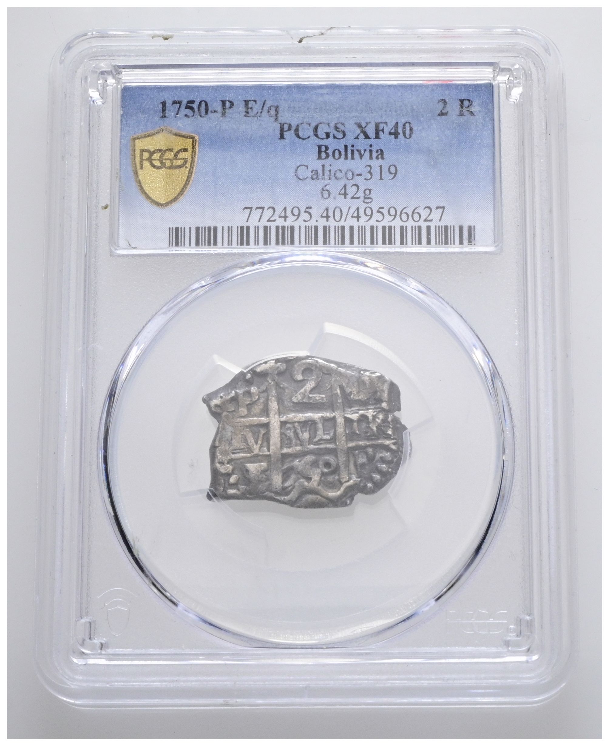 FERNANDO VI (1746-1759). 2 Reales. (Ar. 6,42g/20mm). 1750. Potosí E/q. (Cal-2019-319). Doble fecha. Encapsulada por PCGS XF 40.