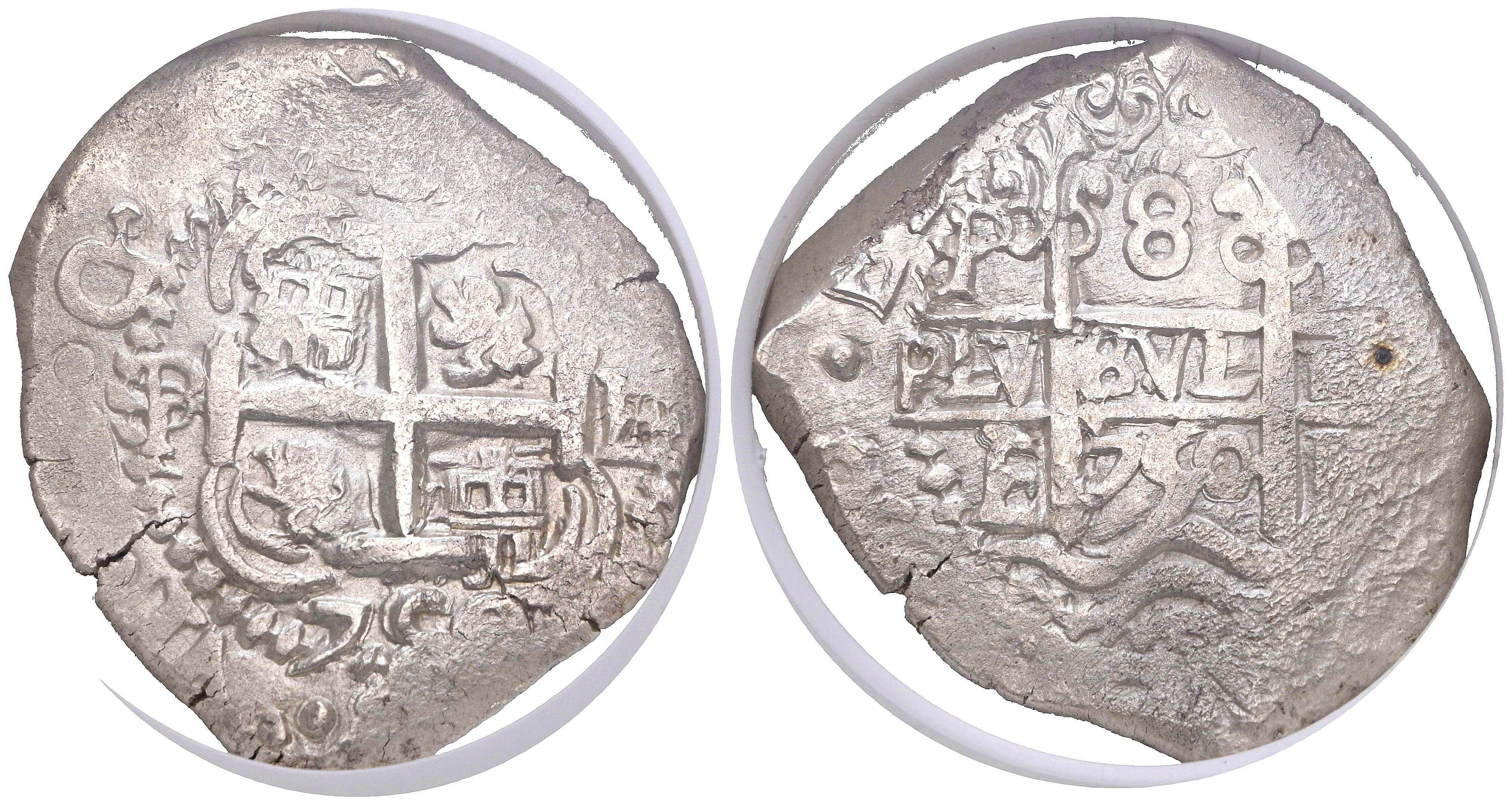 FERNANDO VI (1746-1759). 8 Reales. (Ar. 27,00g/34mm)*. 1750. Potosí E. (Cal-2019-512). Doble fecha. Encapsulado por NGC AU-Excavation Recovery, etiqueta especial "Cerro Rico Hoard". *Peso y medidas teóricas.