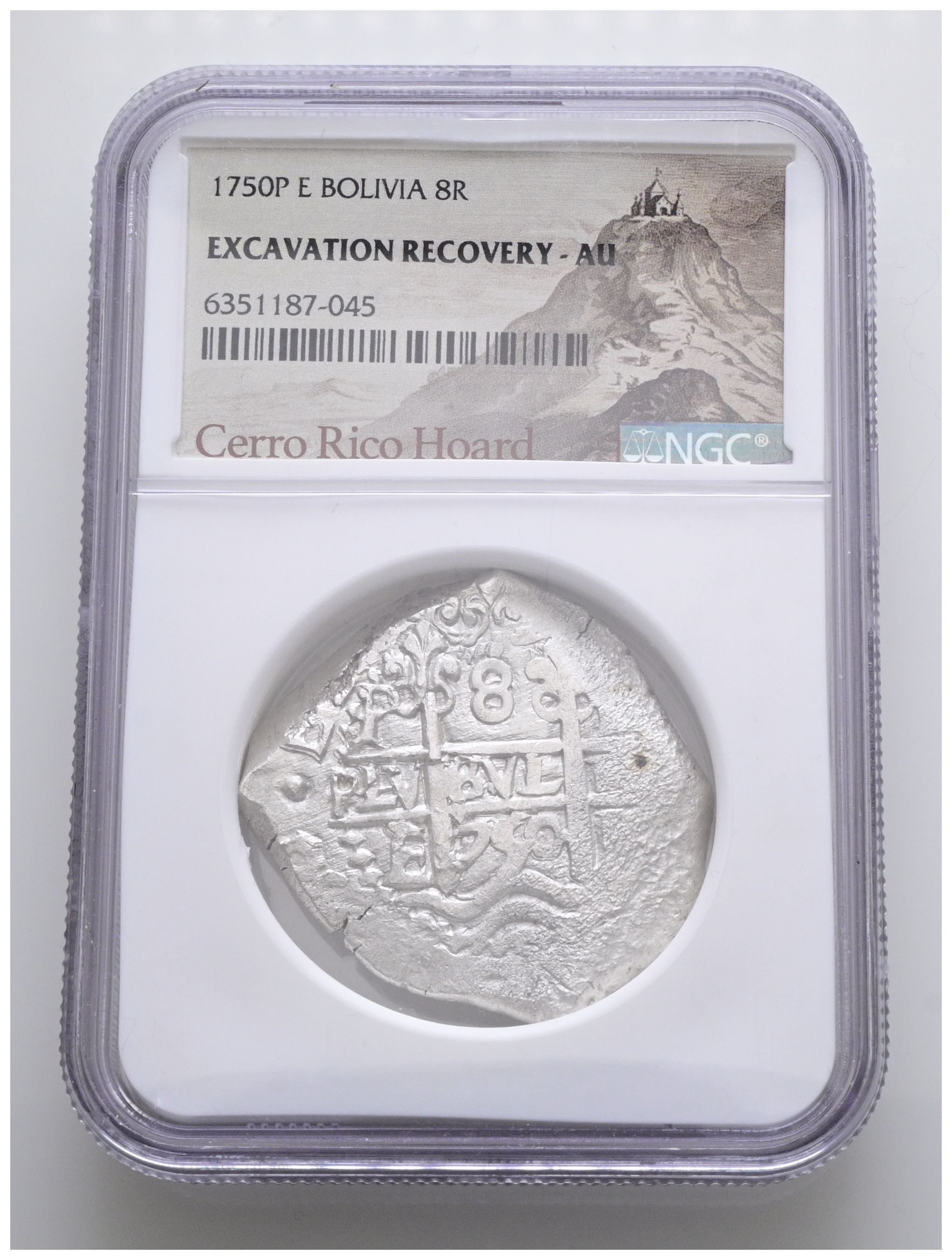 FERNANDO VI (1746-1759). 8 Reales. (Ar. 27,00g/34mm)*. 1750. Potosí E. (Cal-2019-512). Doble fecha. Encapsulado por NGC AU-Excavation Recovery, etiqueta especial "Cerro Rico Hoard". *Peso y medidas teóricas.