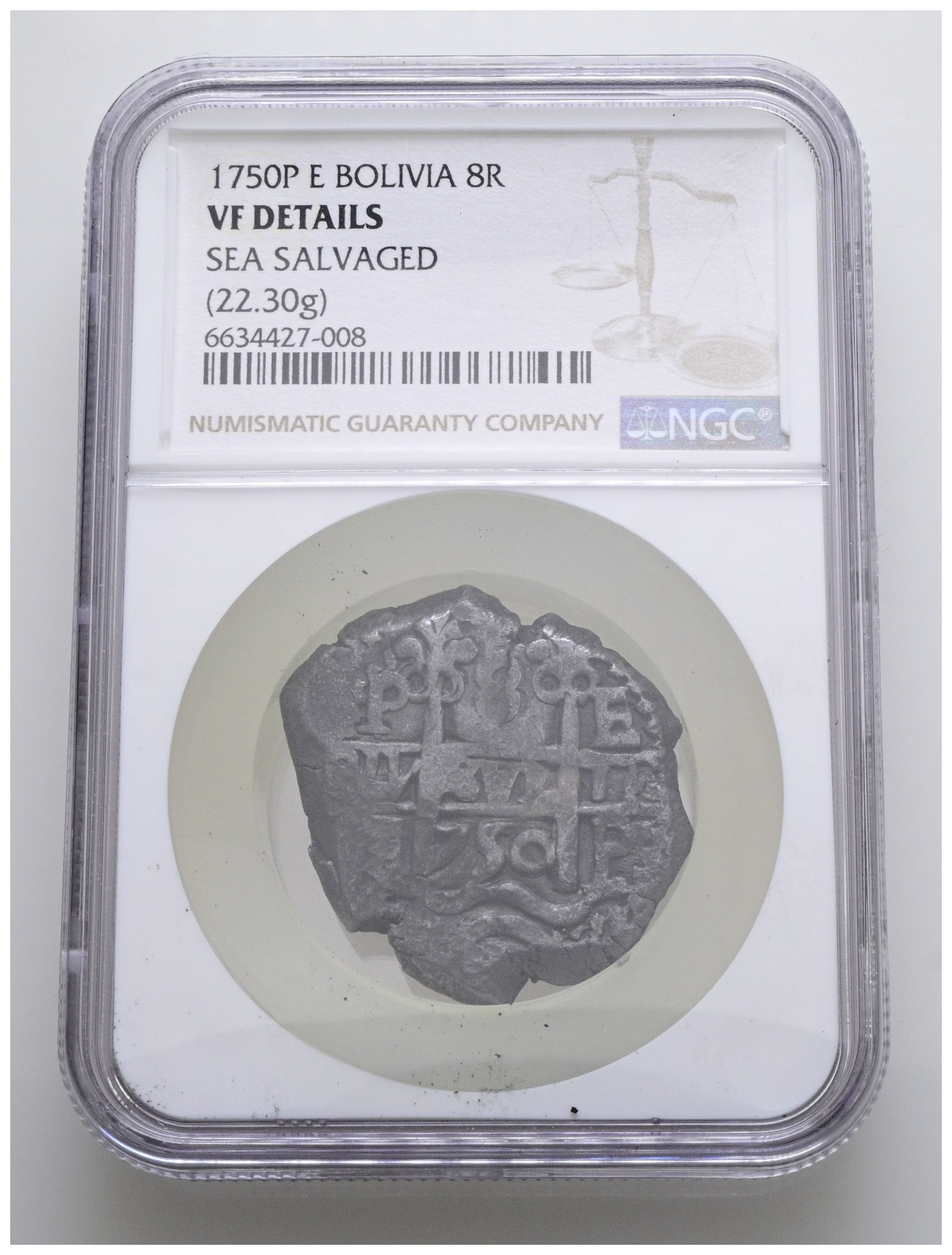 FERNANDO VI (1746-1759). 8 Reales. (Ar. 22,30g/34mm). 1750. Potosí E. (Cal-2019-515). Encapsulado por NGC VF Details, Sea Salvaged.
