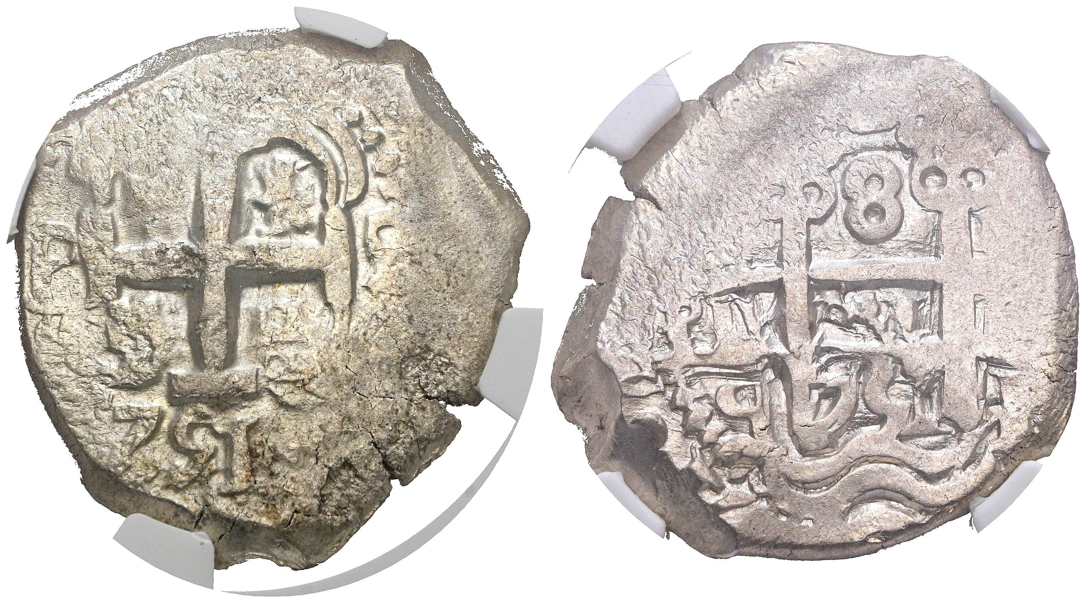 FERNANDO VI (1746-1759). 8 Reales. (Ar. 27,00g/34mm)*. 1751. Potosí q. (Cal-2019-518). Doble fecha. Encapsulado por NGC AU-Excavation Recovery, etiqueta especial "Cerro Rico Hoard". *Peso y medidas teóricas.