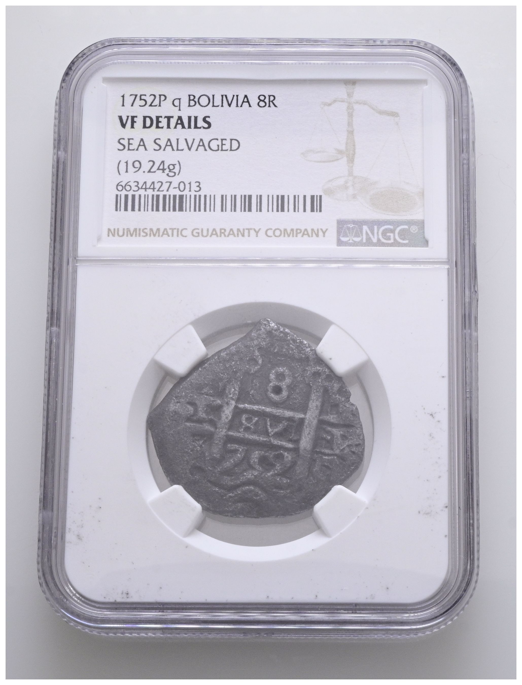 FERNANDO VI (1746-1759). 8 Reales. (Ar. 19,24g/30mm). 1752. Potosí q. (Cal-2019-522). Encapsulado por NGC VF Details, Sea Salvaged.