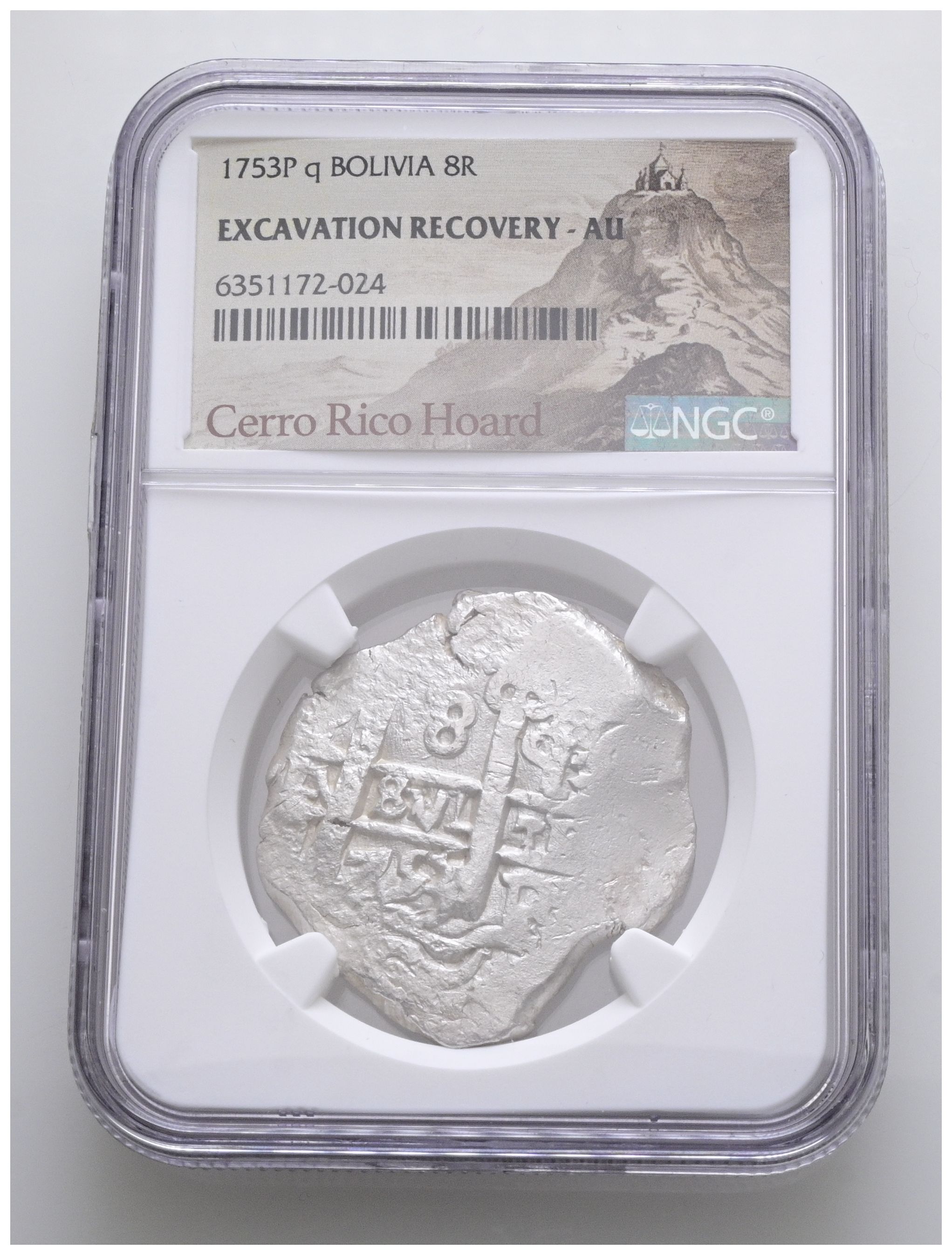 FERNANDO VI (1746-1759). 8 Reales. (Ar. 27,00g/34mm)*. 1753. Potosí q. (Cal-2019-524). Doble fecha. Encapsulado por NGC AU-Excavation Recovery, etiqueta especial "Cerro Rico Hoard". *Peso y medidas teóricas.