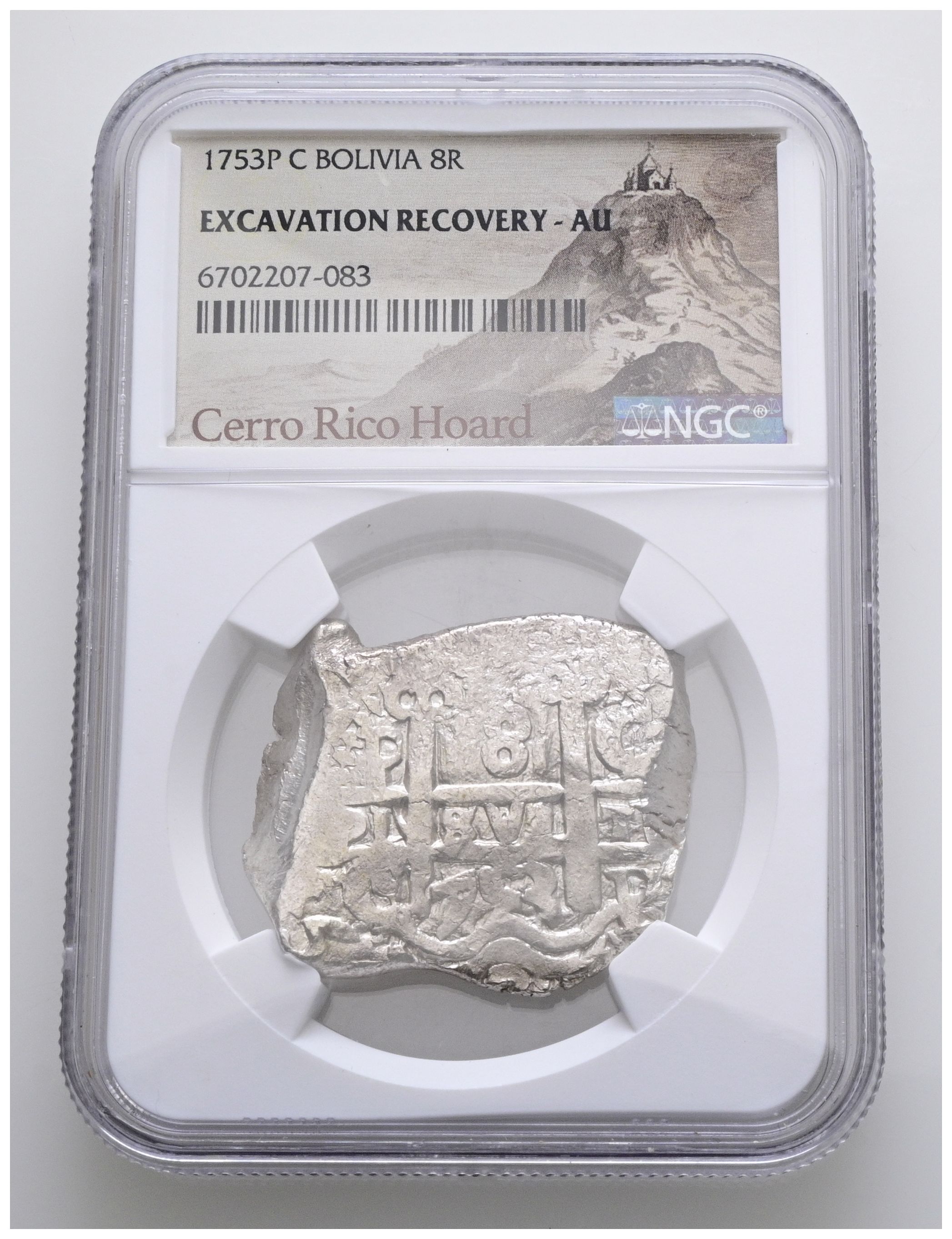 FERNANDO VI (1746-1759). 8 Reales. (Ar. 27,00g/34mm)*. 1753. Potosí C. (Cal-2019-526). Encapsulado por NGC AU-Excavation Recovery, etiqueta especial "Cerro Rico Hoard". *Peso y medidas teóricas.