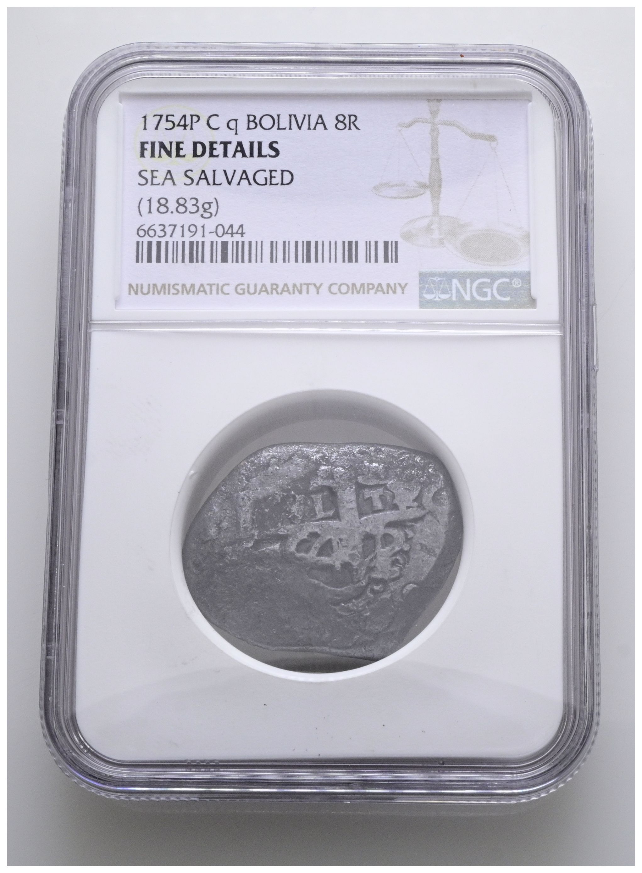 FERNANDO VI (1746-1759). 8 Reales. (Ar. 18,83g/20mm). 1754. Potosí q. (Cal-2019-531). Encapsulado por NGC Fine Details, Sea Salvaged.