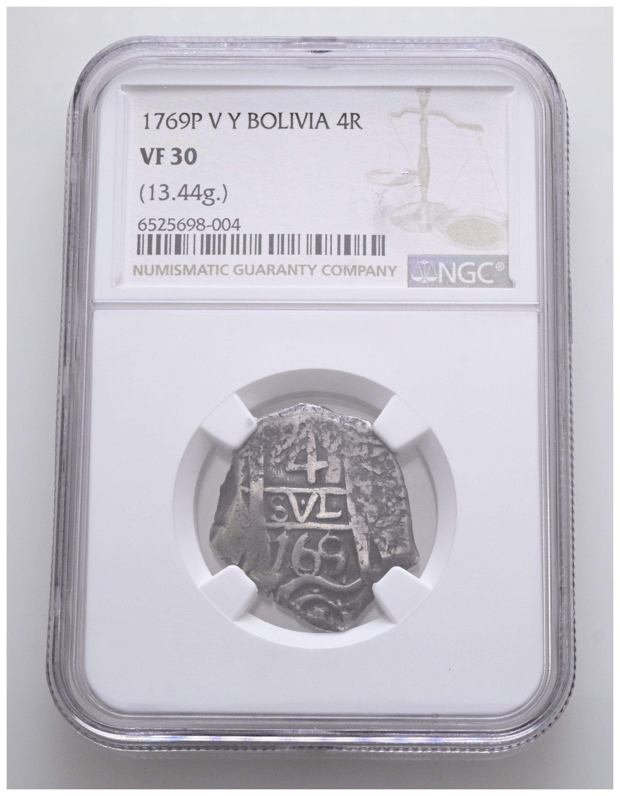 CARLOS III (1759-1788). 4 Reales. (Ar. 13,44g/23mm). 1769. Potosí VY. (Cal-2019-913). Encapsulado por NGC VF 30.