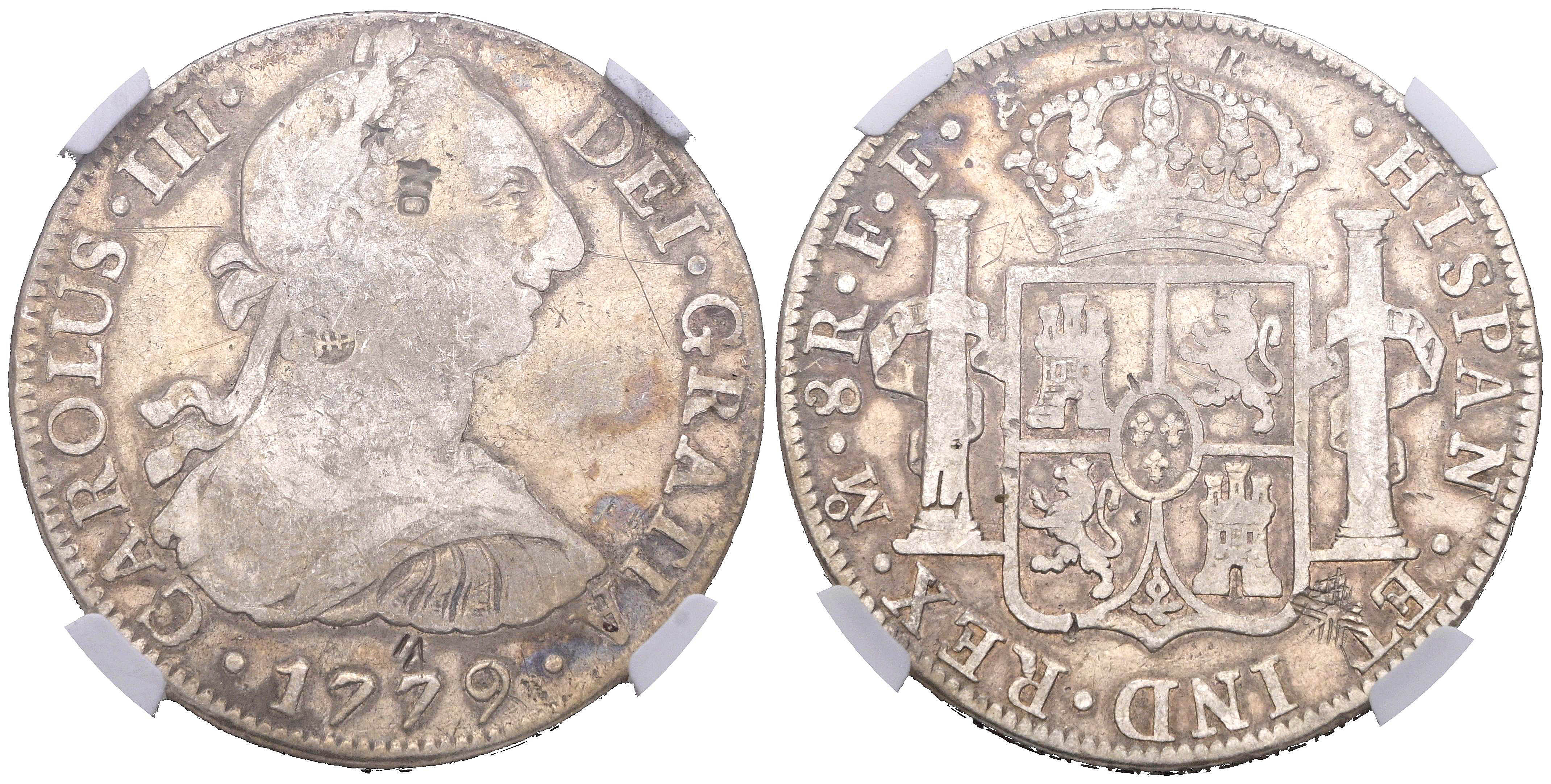CARLOS III (1759-1788). 8 Reales. (Ar. 27,00g/38mm)*. 1779. Mexico FF. (Cal-2019-1118). Encapsulado por NGC Chopmarked. *Peso y medidas teóricos.