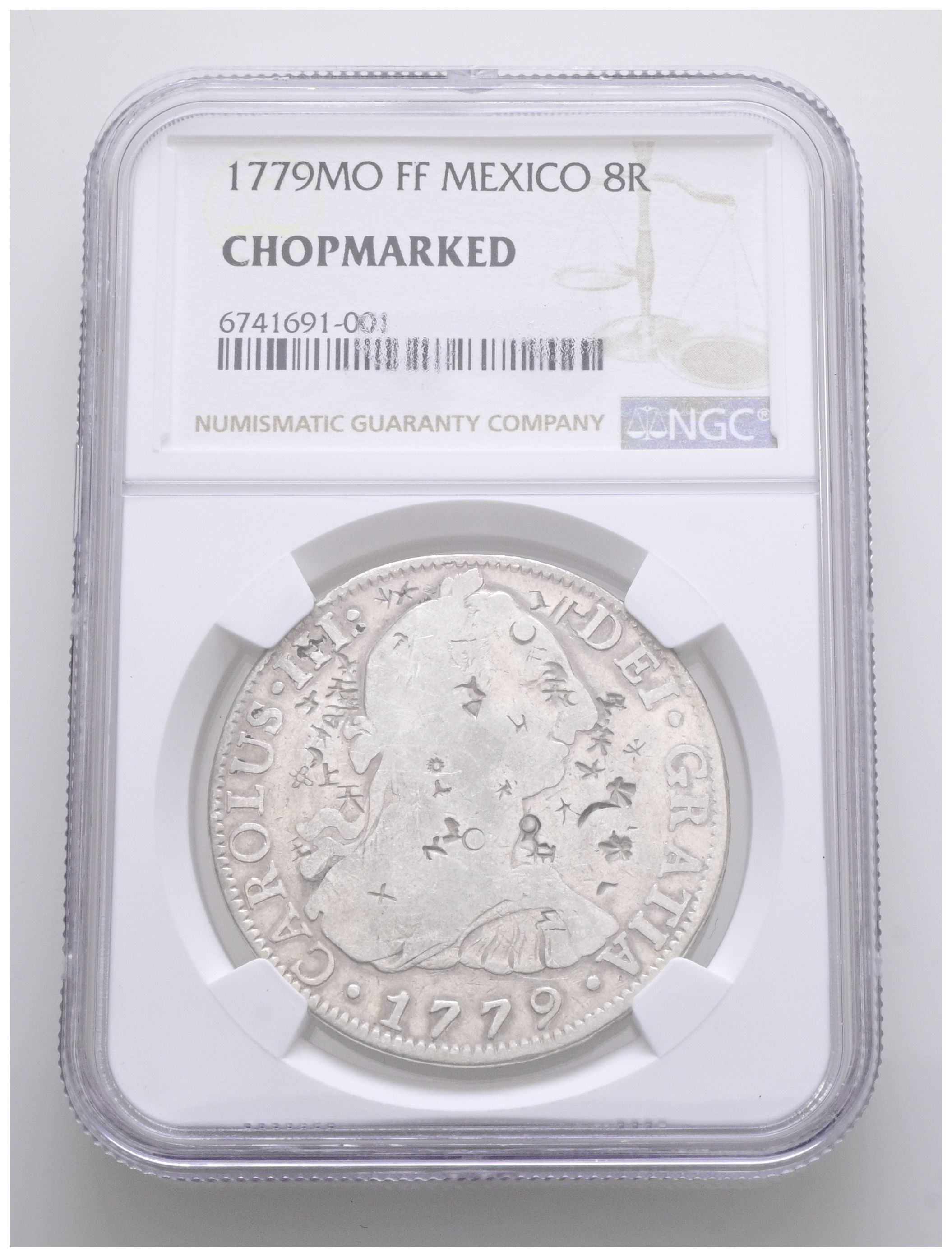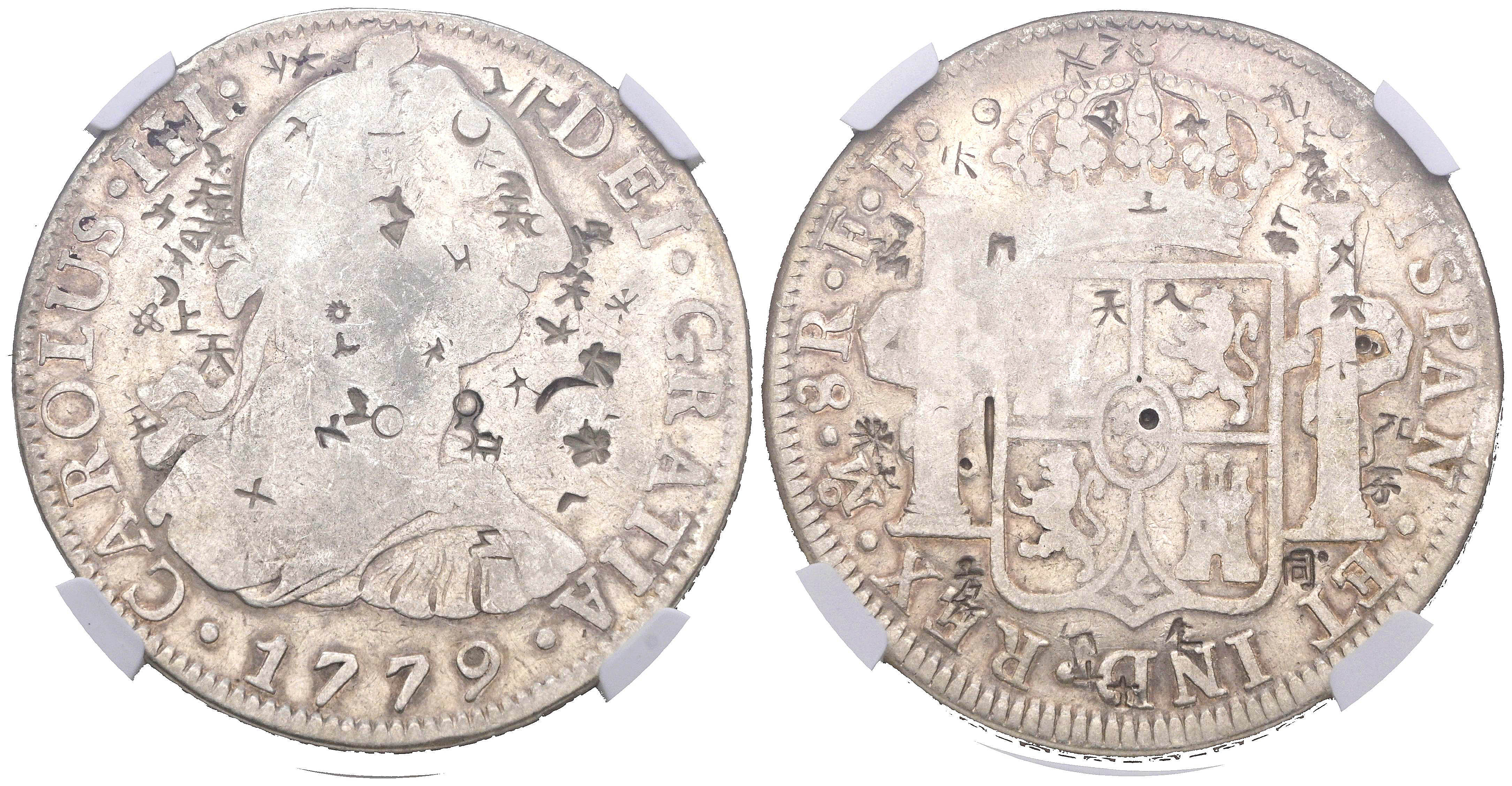 CARLOS III (1759-1788). 8 Reales. (Ar. 27,00g/38mm)*. 1779. Mexico FF. (Cal-2019-1118). Encapsulado por NGC Chopmarked. *Peso y medidas teóricos.