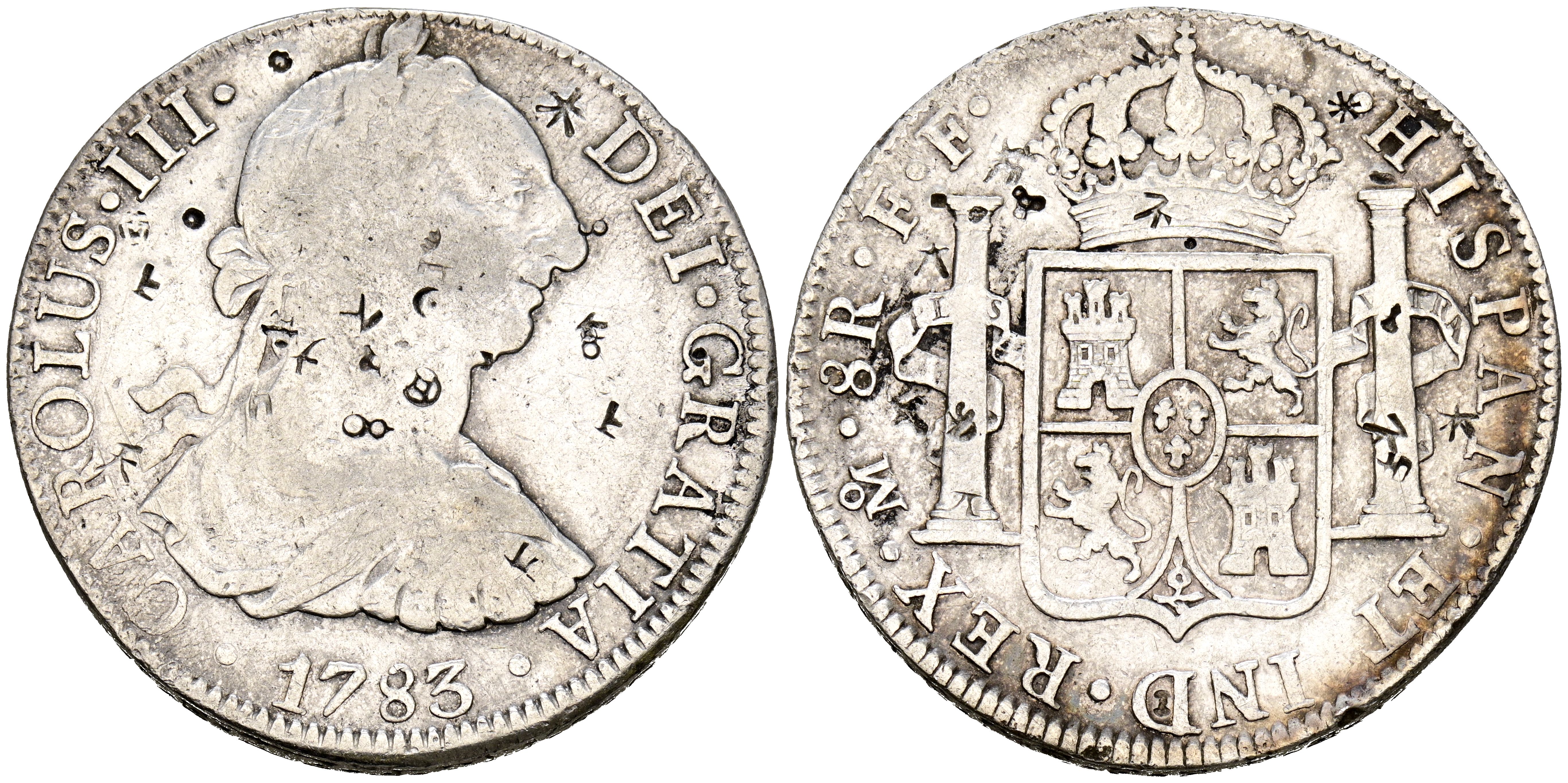 CARLOS III (1759-1788). 8 Reales. (Ar. 26,66g/39mm). 1783. México FF. (Cal-2019-1124). MBC-. Resellos orientales.