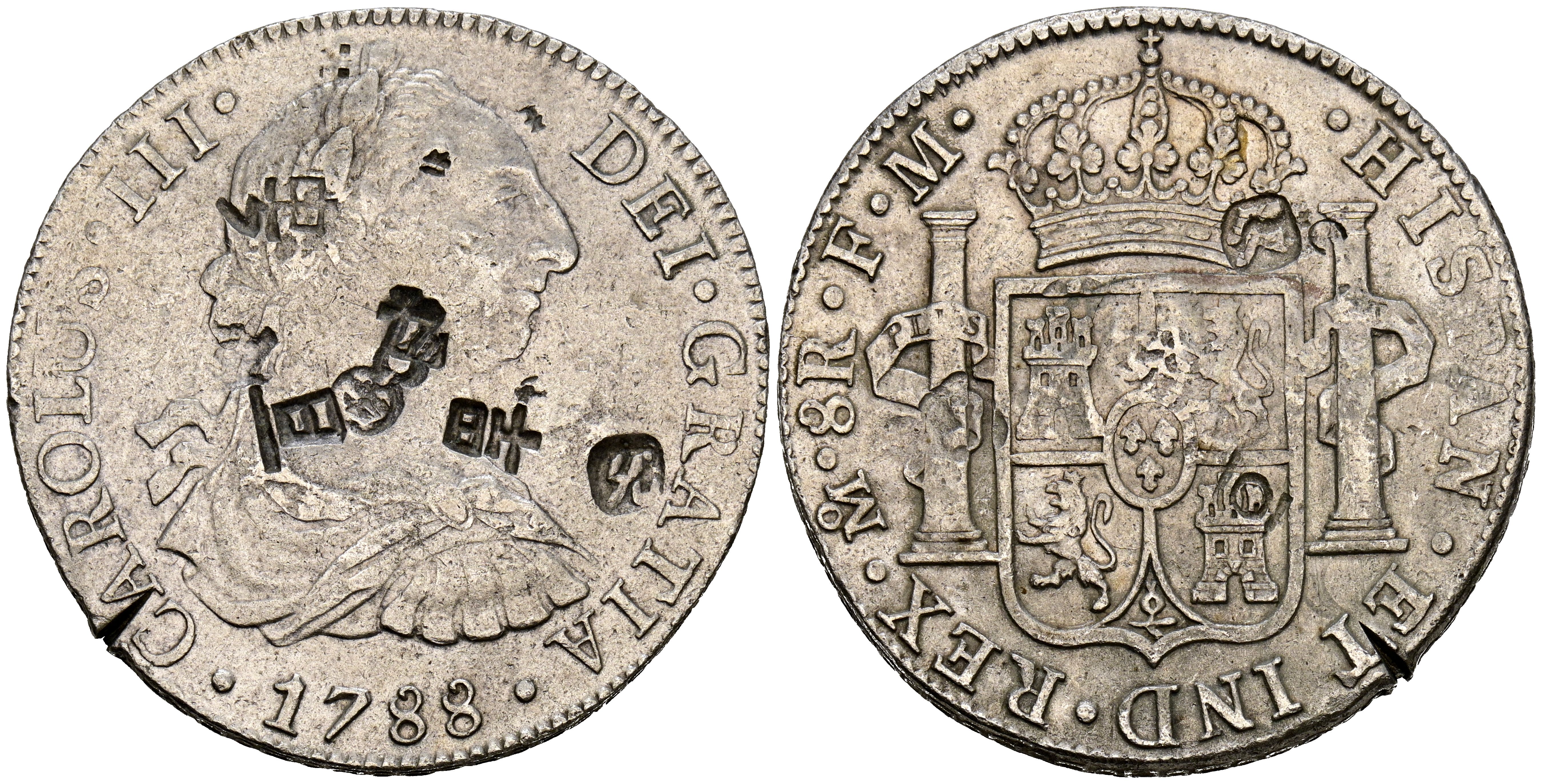 CARLOS III (1759-1788). 8 Reales. (Ar. 25,78g/38mm). 1782. Mexico FF. (Cal-2019-1122). MBC. Resellos orientales.