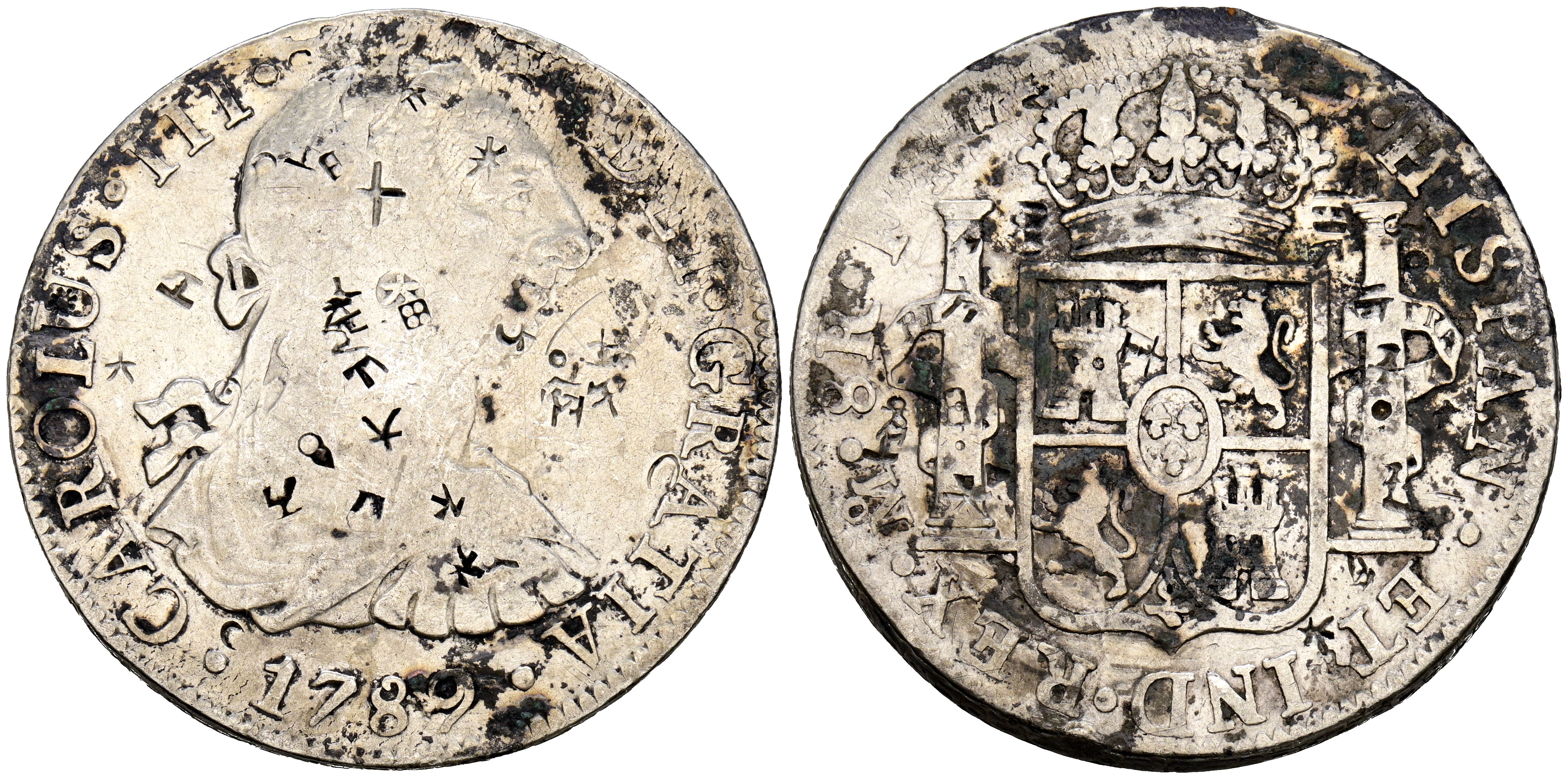 CARLOS III (1759-1788). 8 Reales. (Ar. 26,37g/38mm). 1789. México FM. (Cal-2019-1134). BC. Resellos orientales.