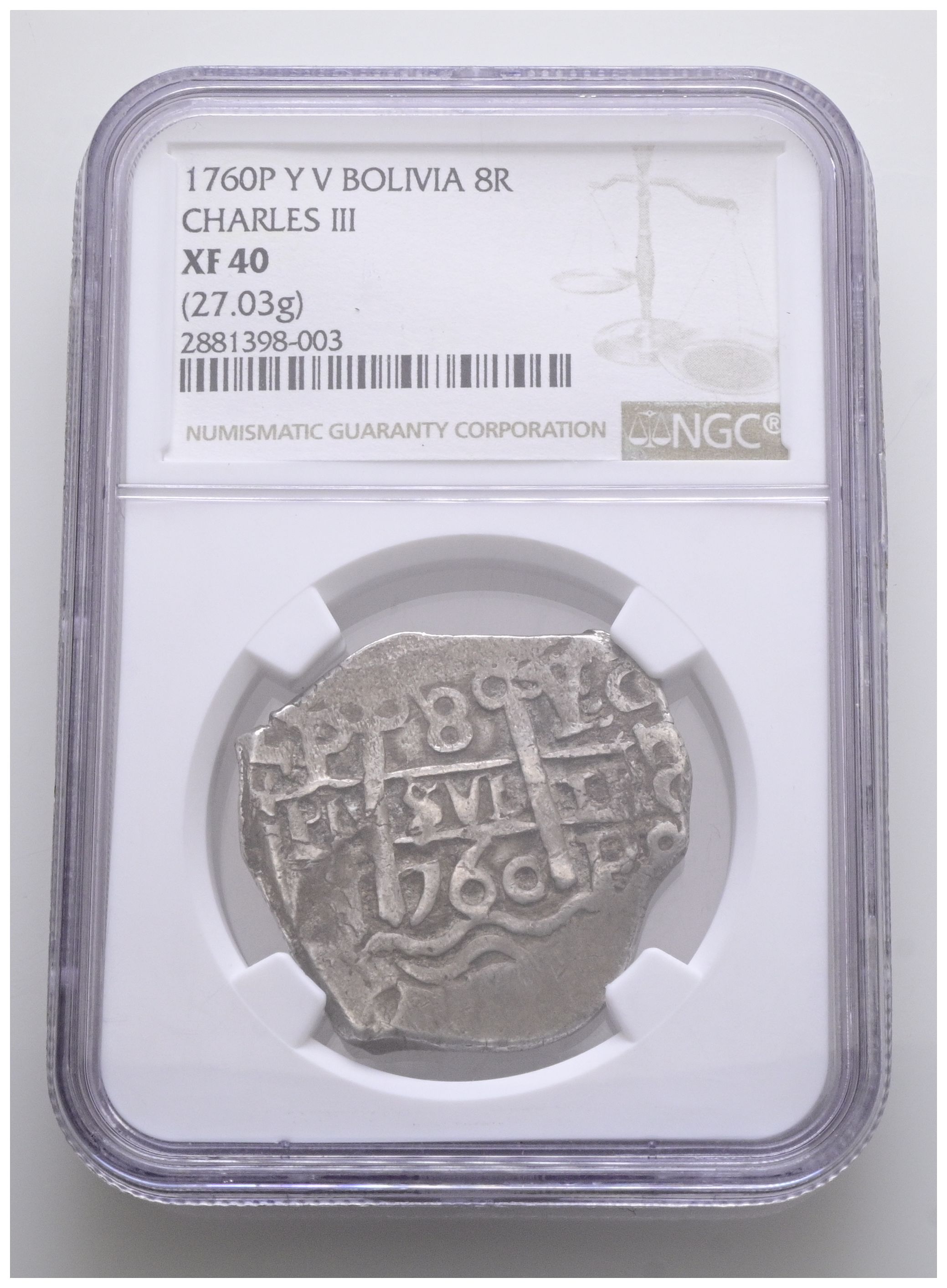 CARLOS III (1759-1788). 8 Reales. (Ar. 27,03g/32mm). 1760. Potosí VY. (Cal-2019-1136). Encapsulado por NGC XF 40.