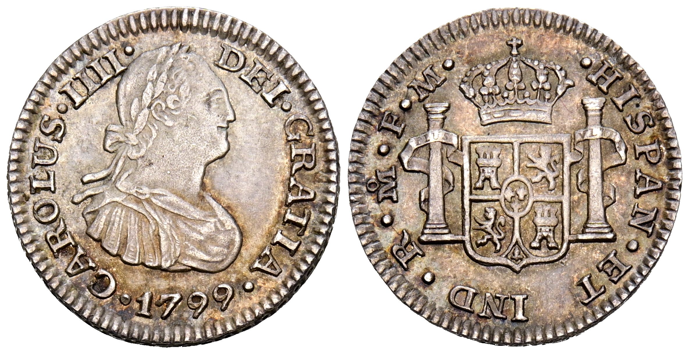 CARLOS IV (1788-1808). 1/2 Real. (Ar. 1,68g/16mm). 1799. México FM. (Cal-2019-283). MBC+. Preciosa pátina.