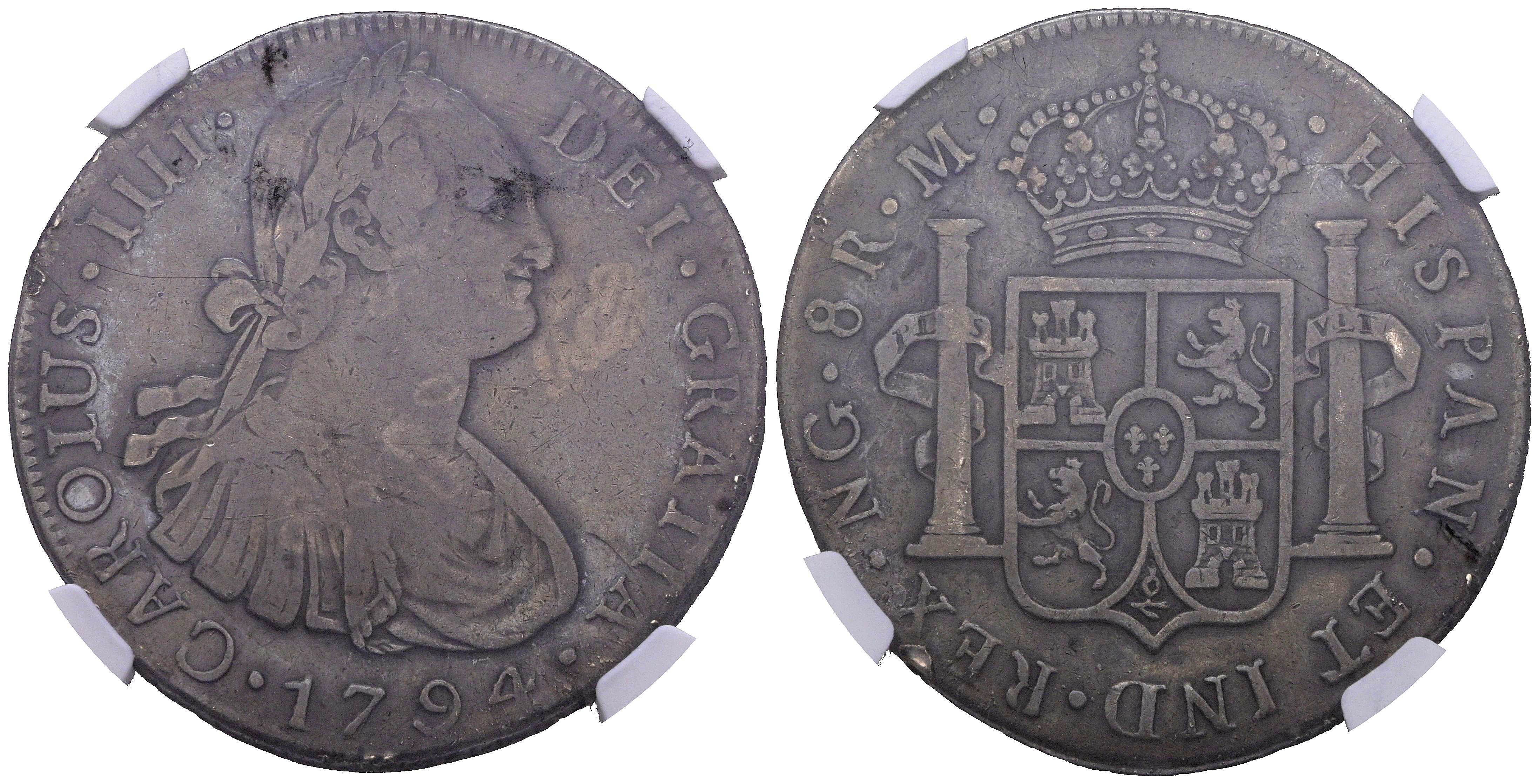 CARLOS IV (1788-1808). 8 Reales. (Ar. 27,00g/38mm)*. 1794. Guatemala M. (Cal-2019-884). Encapsulada por NGC VF Details, Stained. *Peso y medida teóricos.