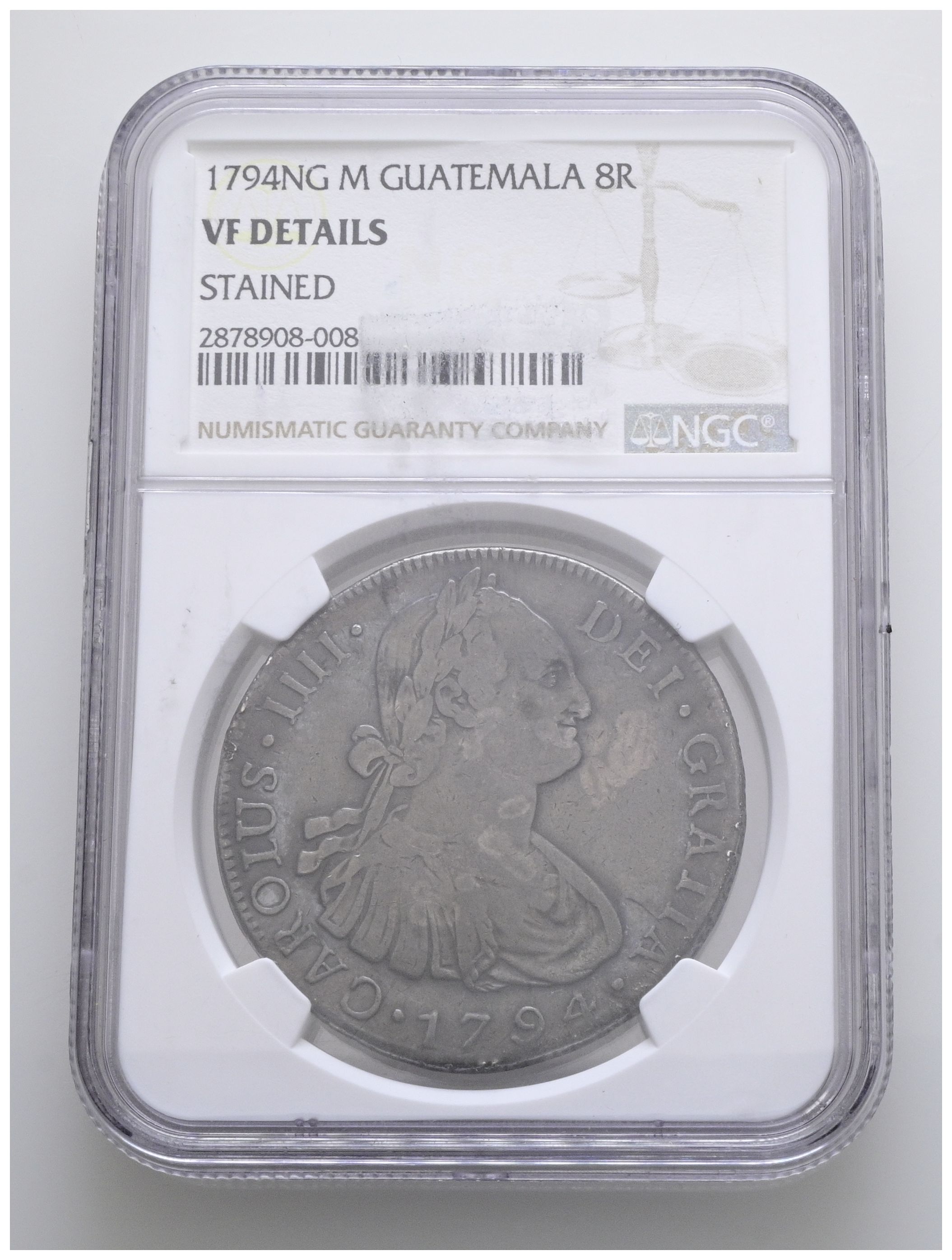CARLOS IV (1788-1808). 8 Reales. (Ar. 27,00g/38mm)*. 1794. Guatemala M. (Cal-2019-884). Encapsulada por NGC VF Details, Stained. *Peso y medida teóricos.