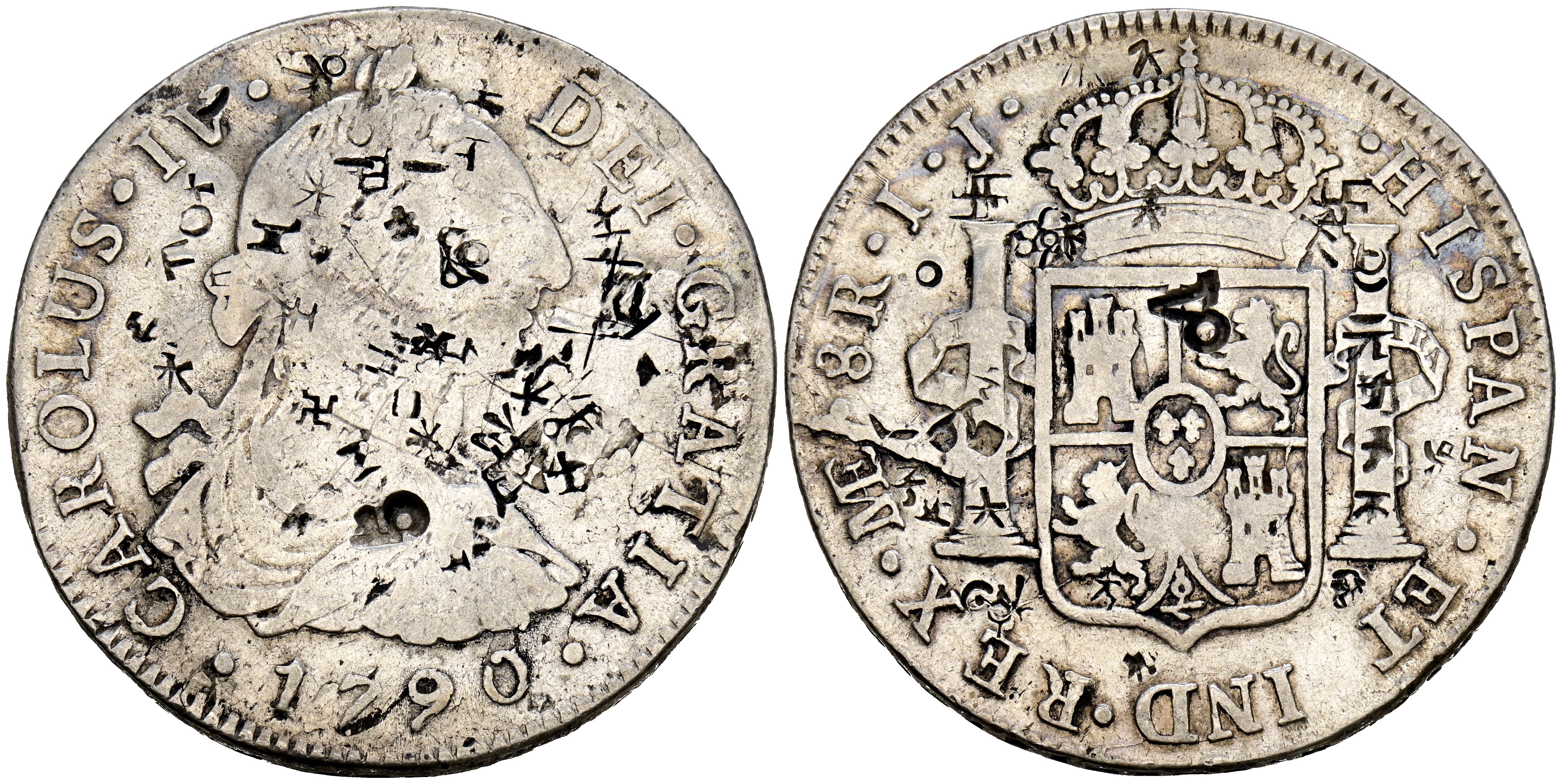 CARLOS IV (1788-1808). 8 Reales. (Ar. 26,44g/39mm). 1790. Lima IJ. (Cal-2019-904). Busto de Carlos III, ordinal IV. MBC. Numerosos resellos orientales. Escasa.