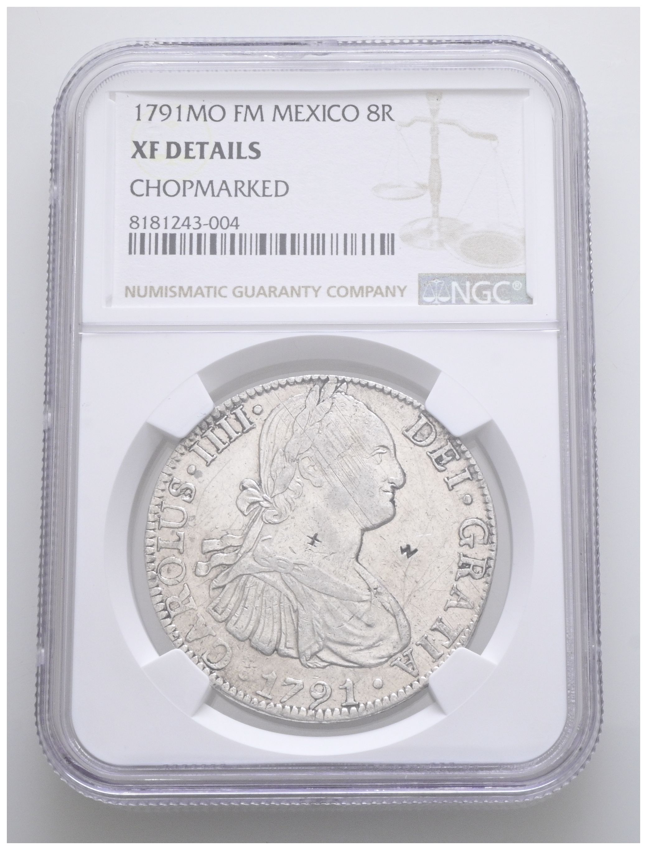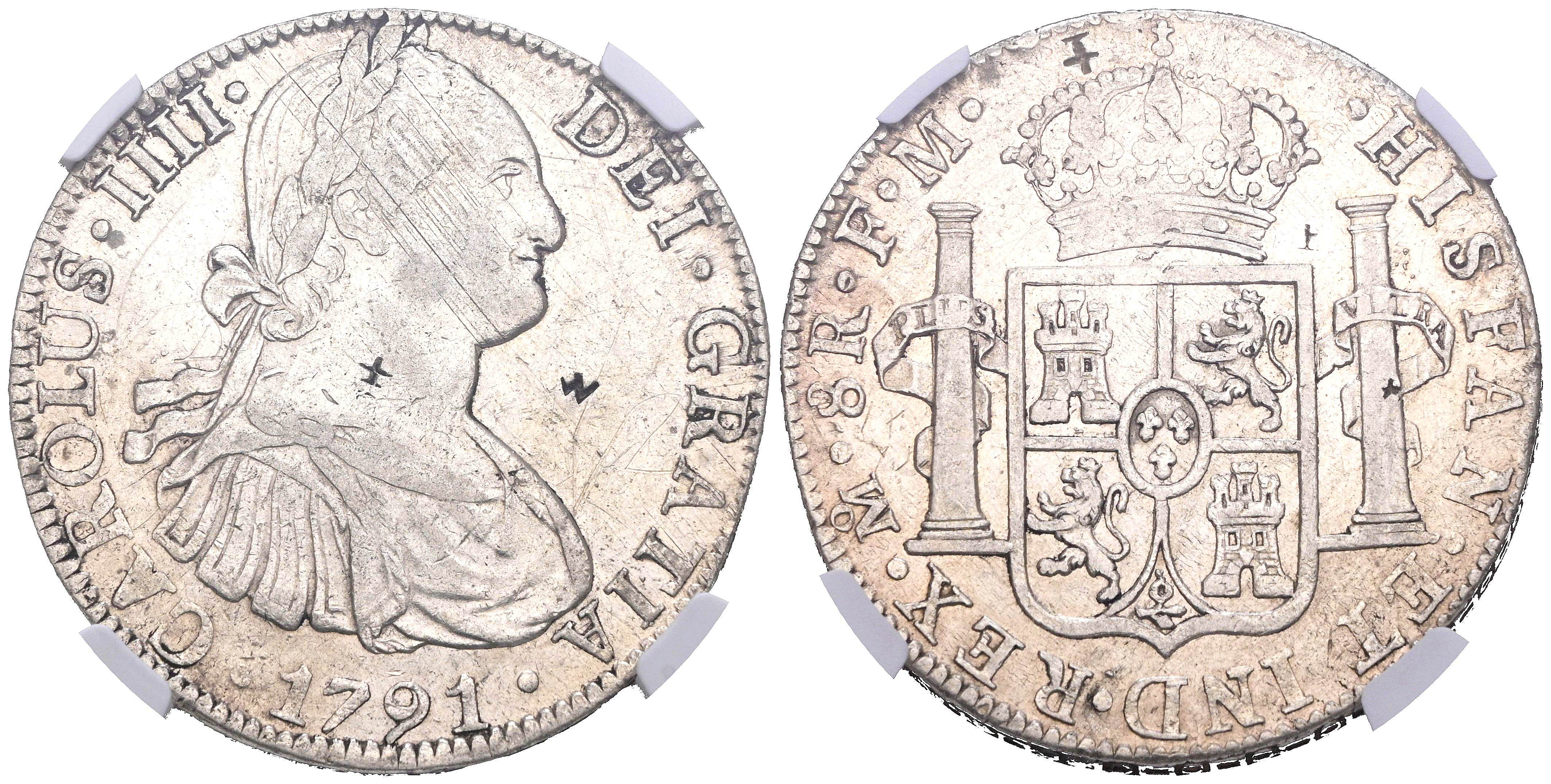 CARLOS IV (1788-1808). 8 Reales. (Ar. 27,00g/39mm)*. 1791. México FM. (Cal-2019-953). Encapsulado por NGC XF Details, Chopmarked. *Peso y medidas teóricos.