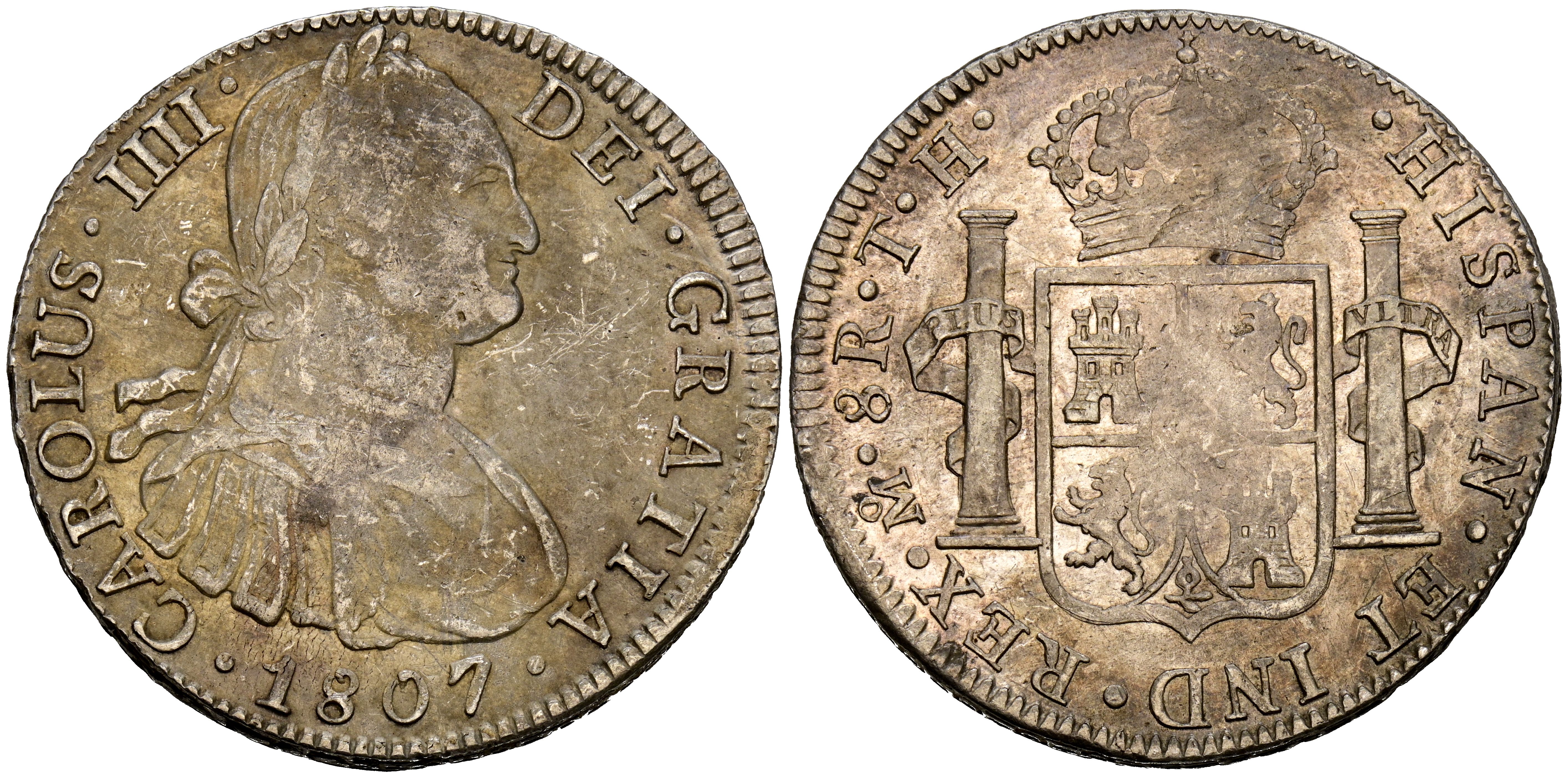 CARLOS IV (1788-1808). 8 Reales. (Ar. 26,95g/39mm). 1807. Mexico TH. (Cal-2019-984). MBC+/EBC-. Vanos de acuñación. Bonita pátina y restos de brillo original en reverso. Atractivo ejemplar.