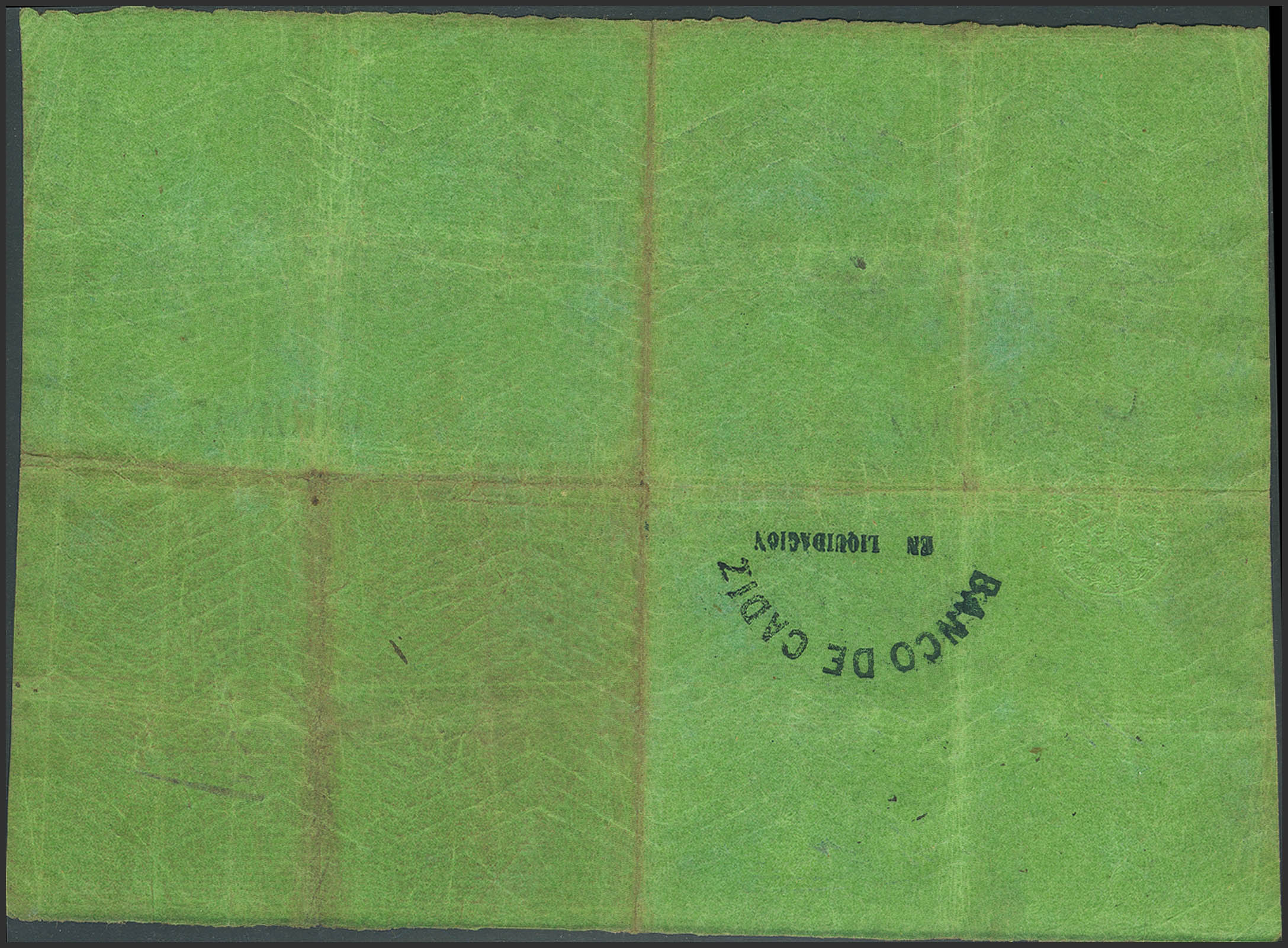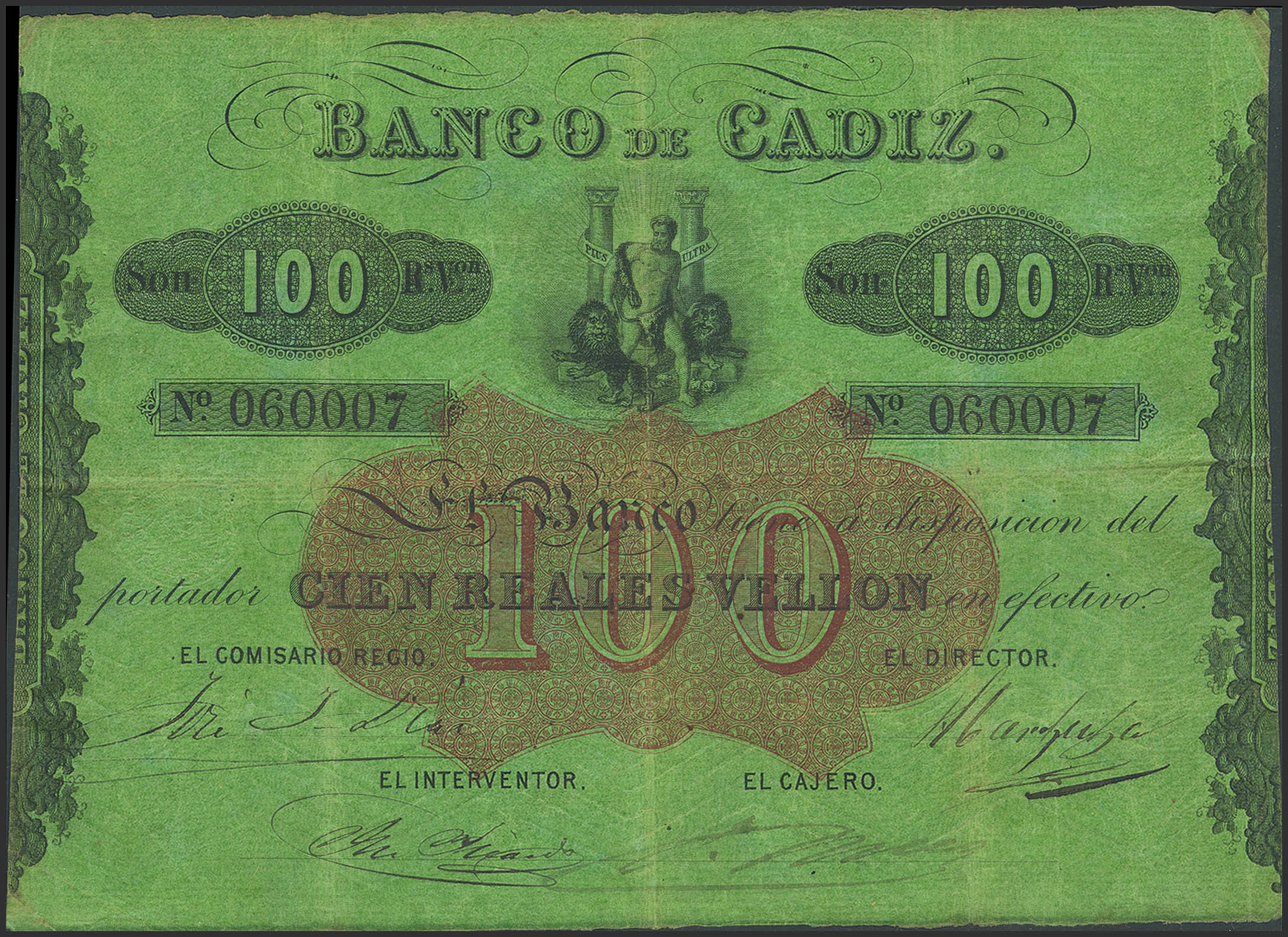 BANCO DE CADIZ. Emisión III. 100 Reales. (Sin fechar). Cuatro firmas y resello en seco. (Edifil 2023: 78). Raro. MBC-.