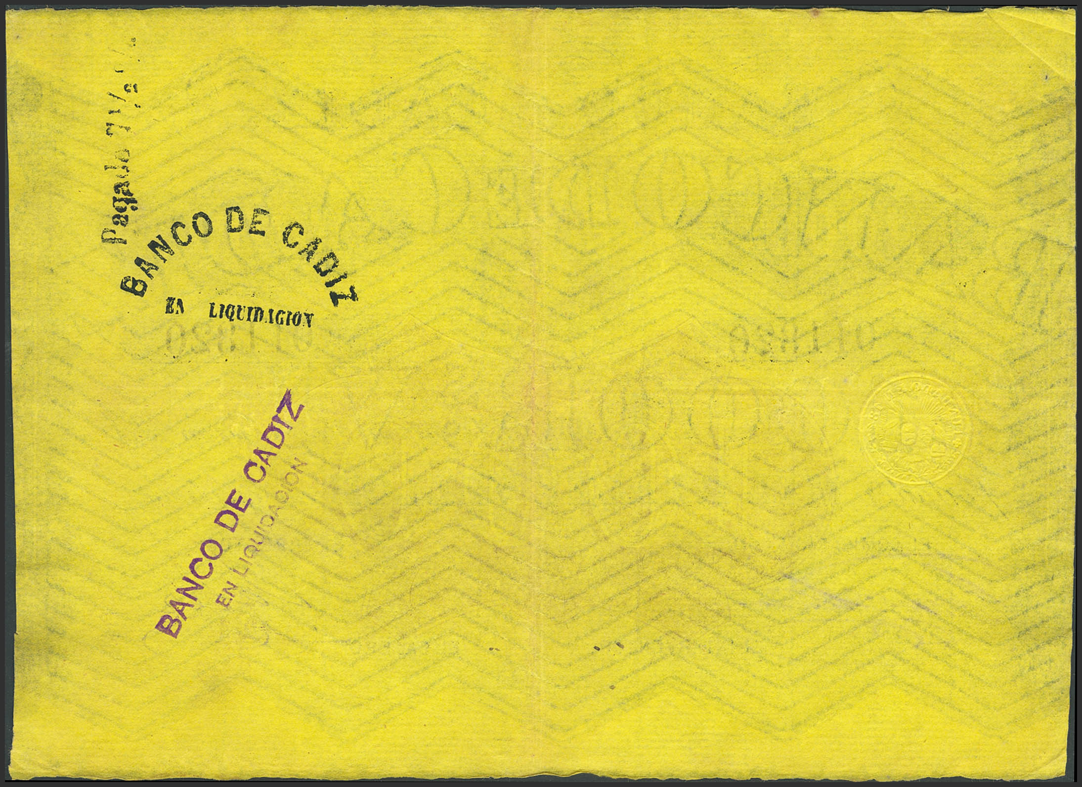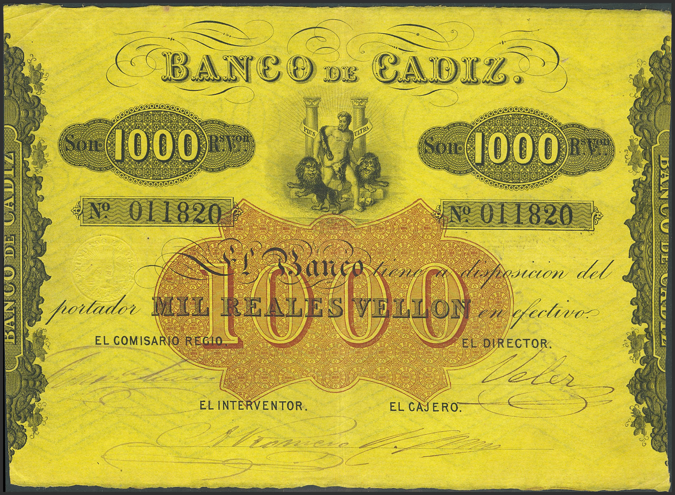 BANCO DE CADIZ. Emisión III. 1000 Reales. (Sin fechar). Cuatro firmas y resello en seco. (Edifil 2023: 81). Raro. MBC+.