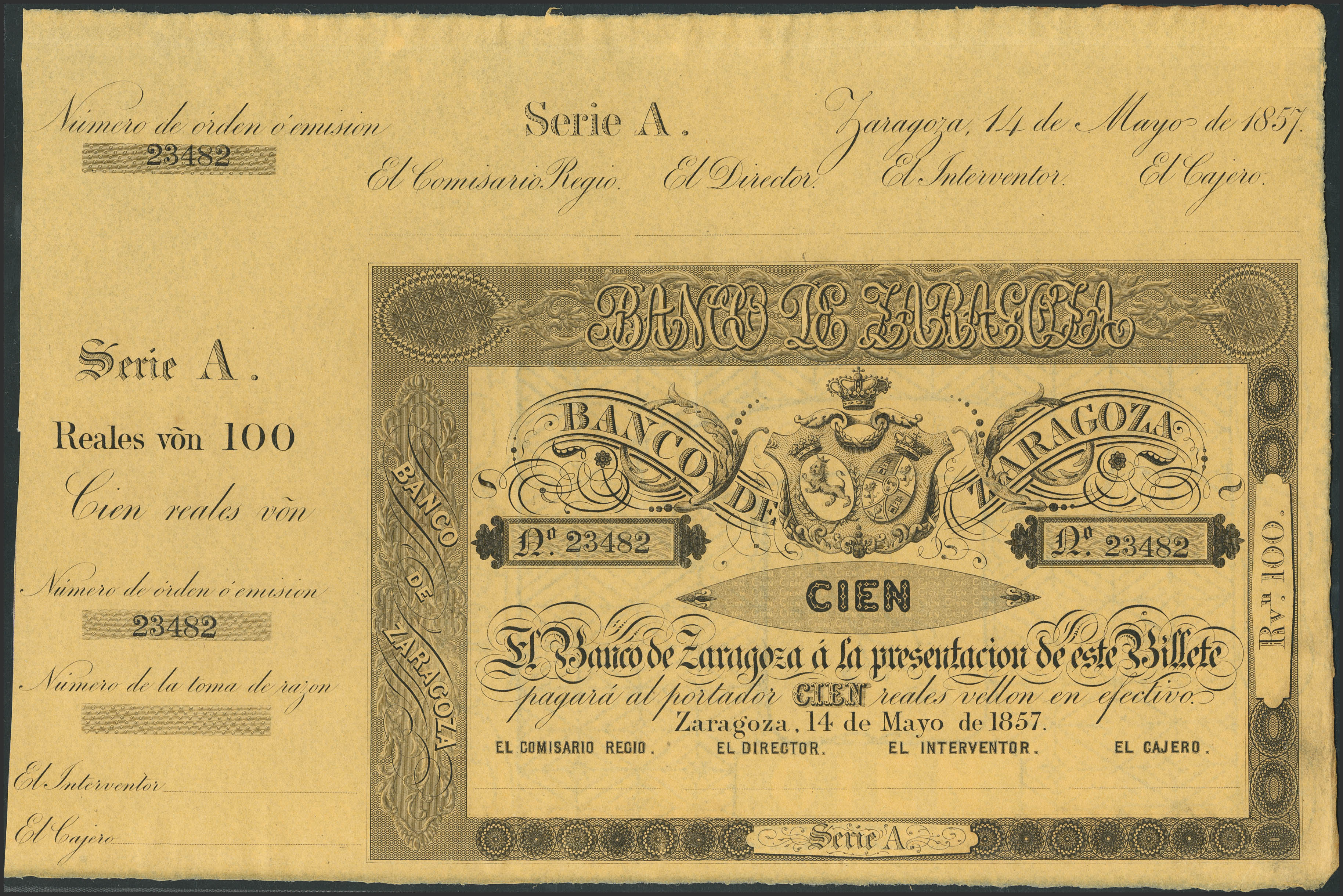 100 Reales de Vellón. 14 de Mayo de 1857. Banco de Zaragoza. Serie A y con matriz. (Edifil 2023: 126B). Apresto original. SC-.