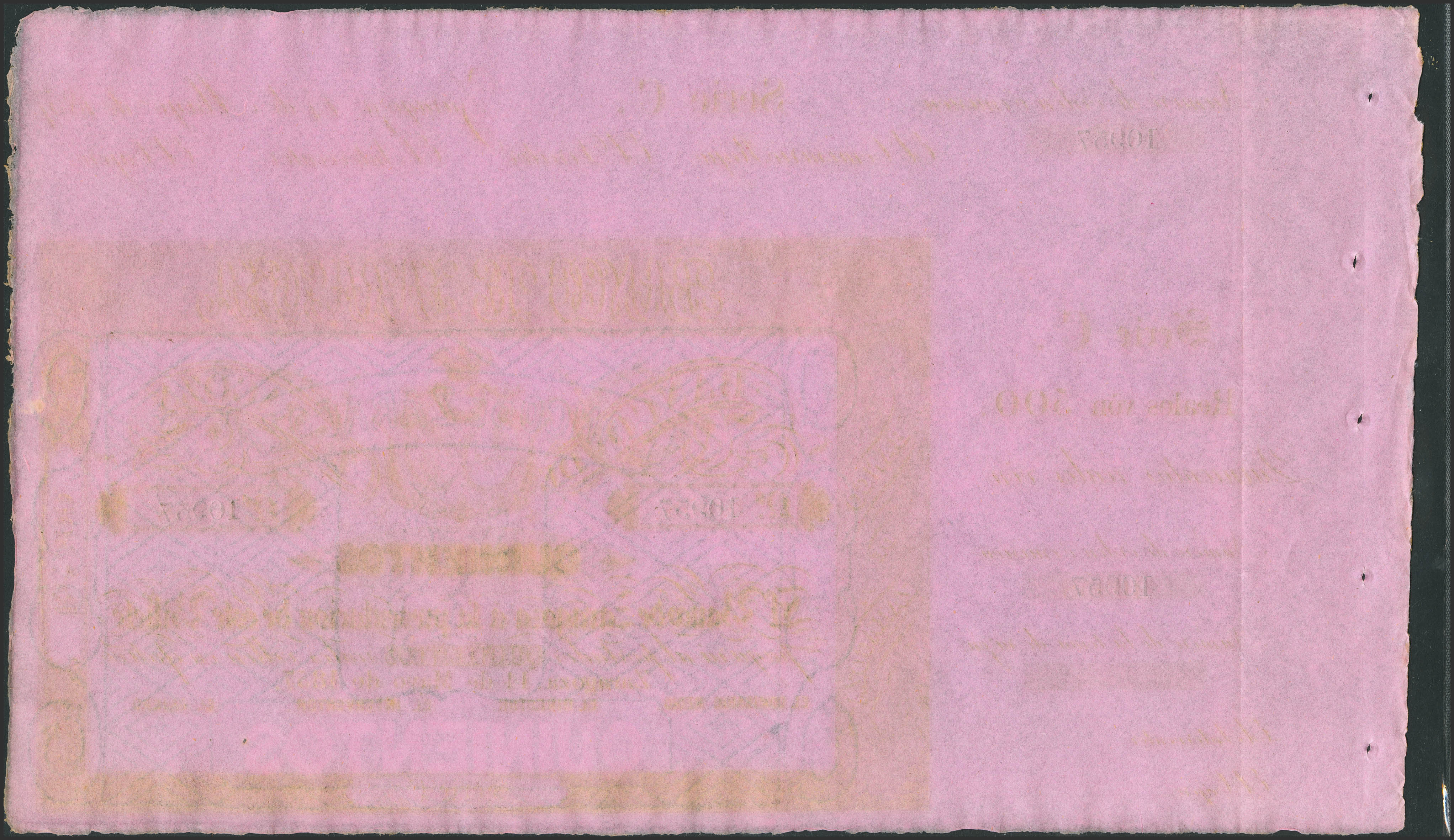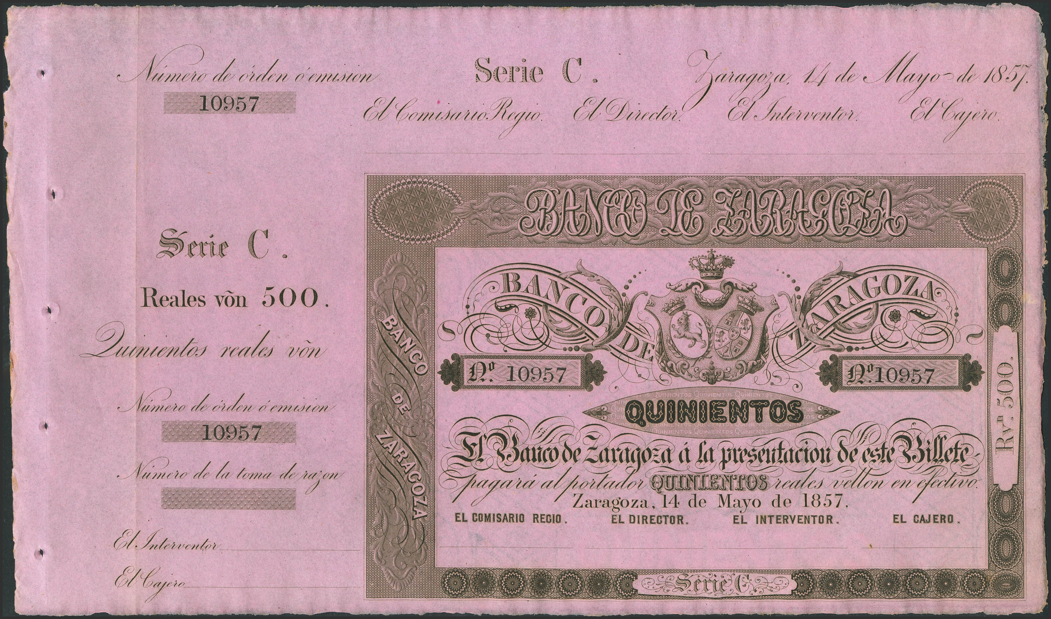 500 Reales. 14 de Mayo de 1857. Banco de Zaragoza. Serie C y con matriz. (Edifil 2023: 128B). Apresto original. EBC+++.