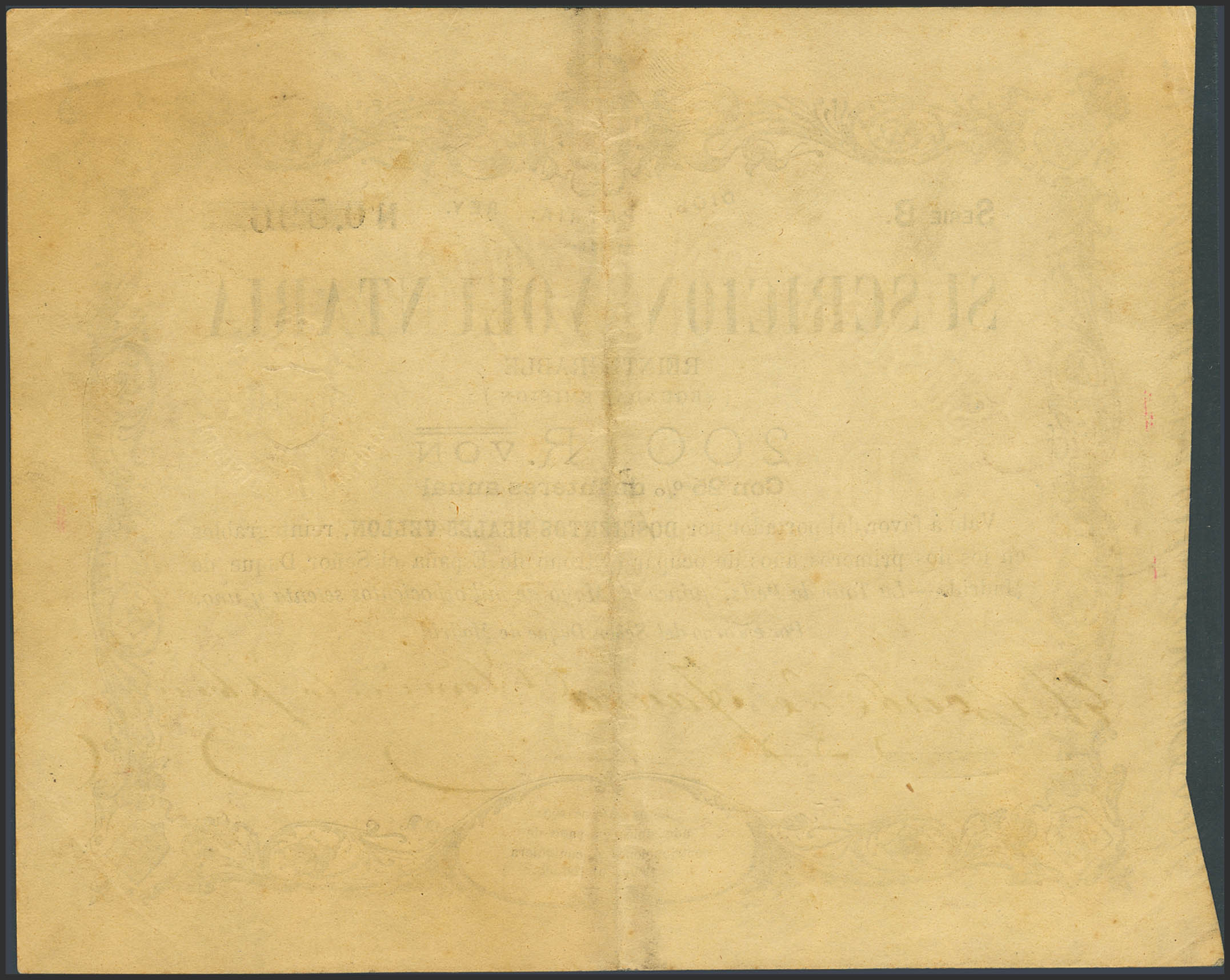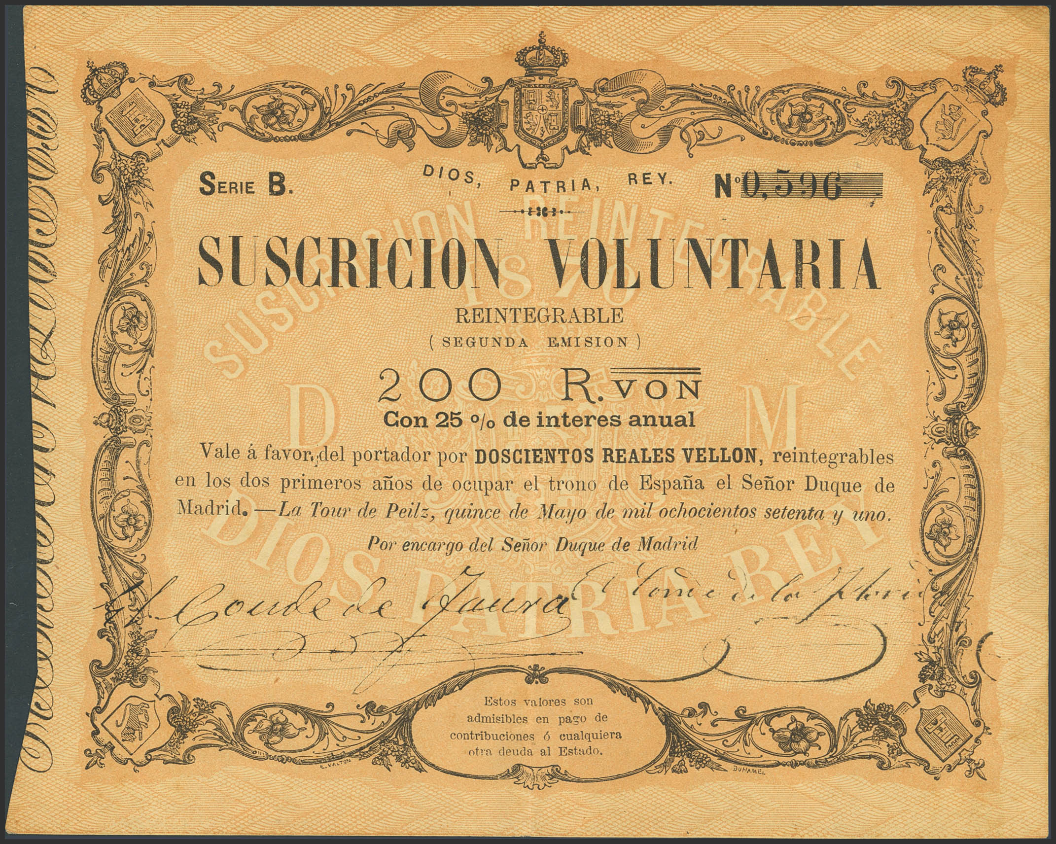 200 Reales de Vellón. 15 de Mayo de 1870. Segunda emisión de Tour de Peilz. Serie B. (Edifil 2023: 203). EBC-.
