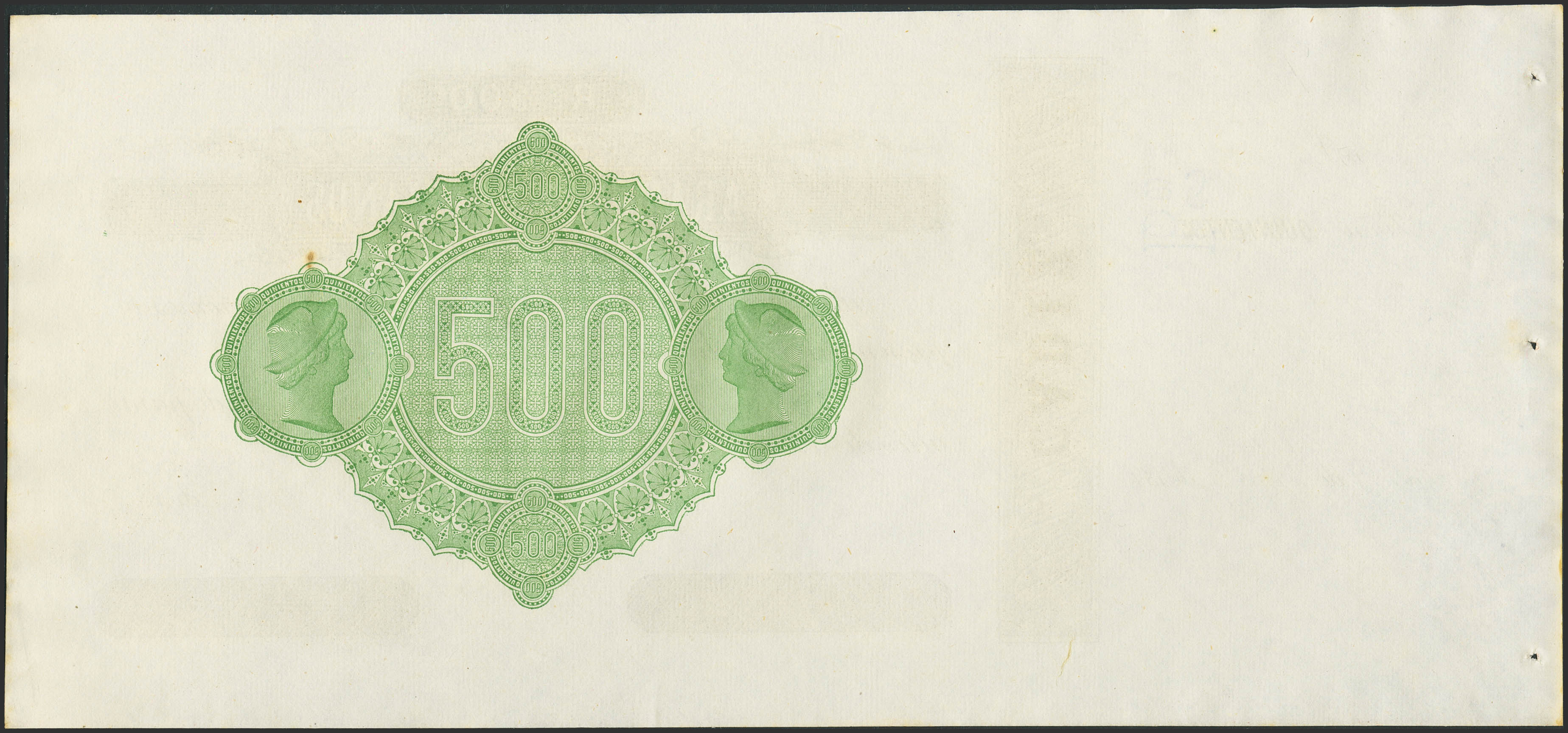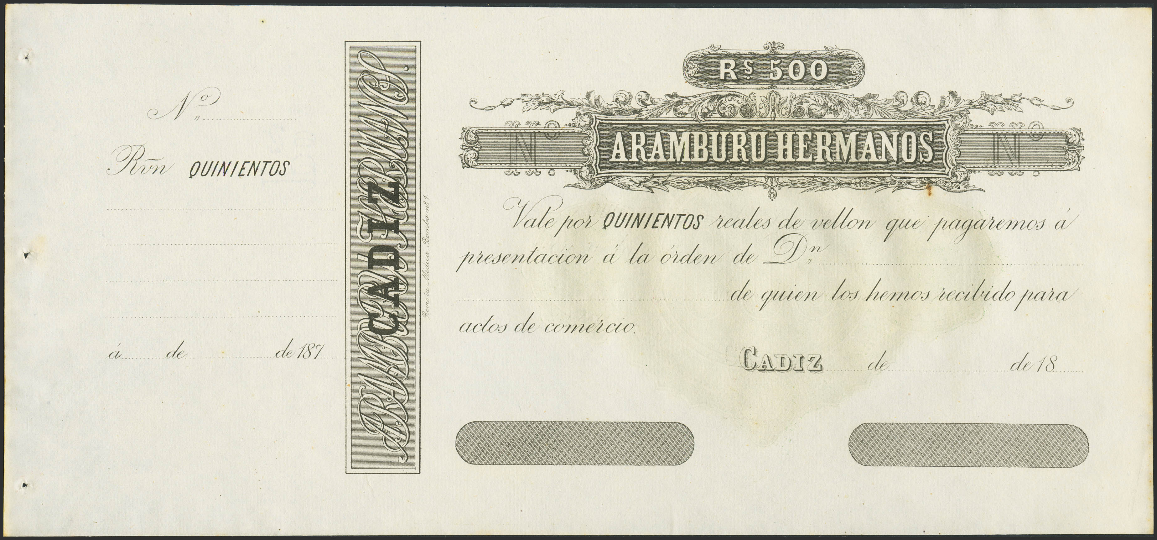 500 Reales de Vellón. (187_ca). Aramburu Hermanos, Cádiz (matriz a la izquierda). Para entender mejor la contextualización de este billete recomendamos la obra "Obligaciones, vales y documentos puestos en circulación como papel moneda en España", de Don Ramón Cobo Huici. SC--.