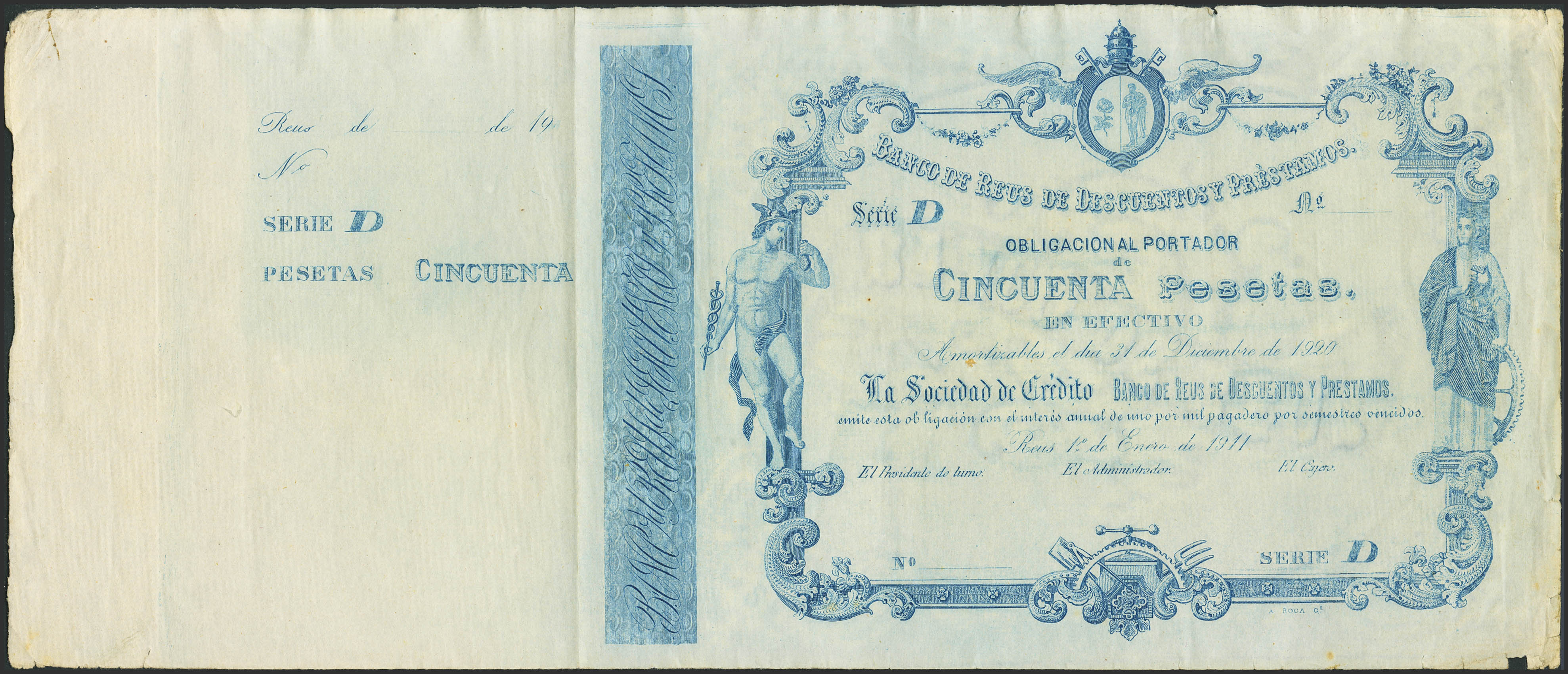 50 Pesetas. 1 de Enero de 1911. Banco de Reus. Serie D, sin numeración, sin firmas y con matriz a la izquierda. Muy raro. Para entender mejor la contextualización de este Banco recomendamos la obra "Obligaciones, vales y documentos puestos en circulación como papel moneda en España", de Don Ramón Cobo Huici. EBC-