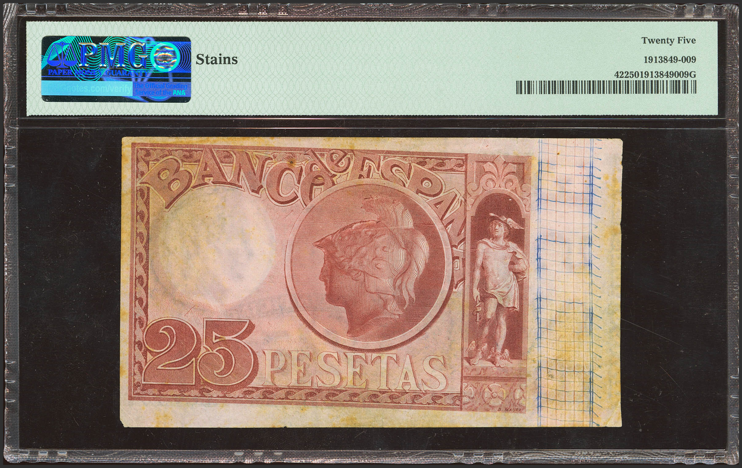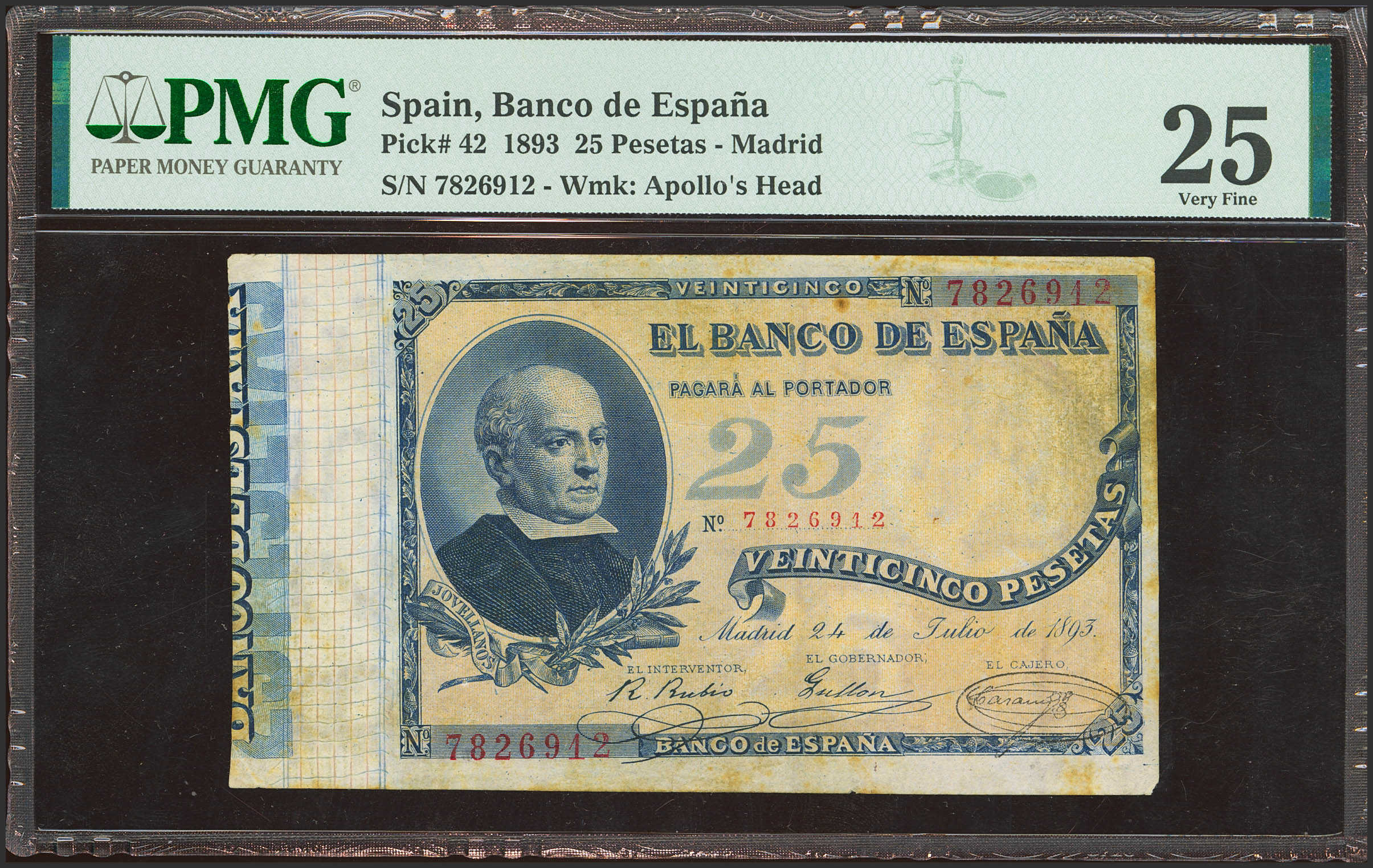 25 Pesetas. 24 de Julio de 1893. Sin serie. (Edifil 2023: 300, Pick: 42). Sombritas del tiempo. MBC+. Encapsulado PMG25 (stains).