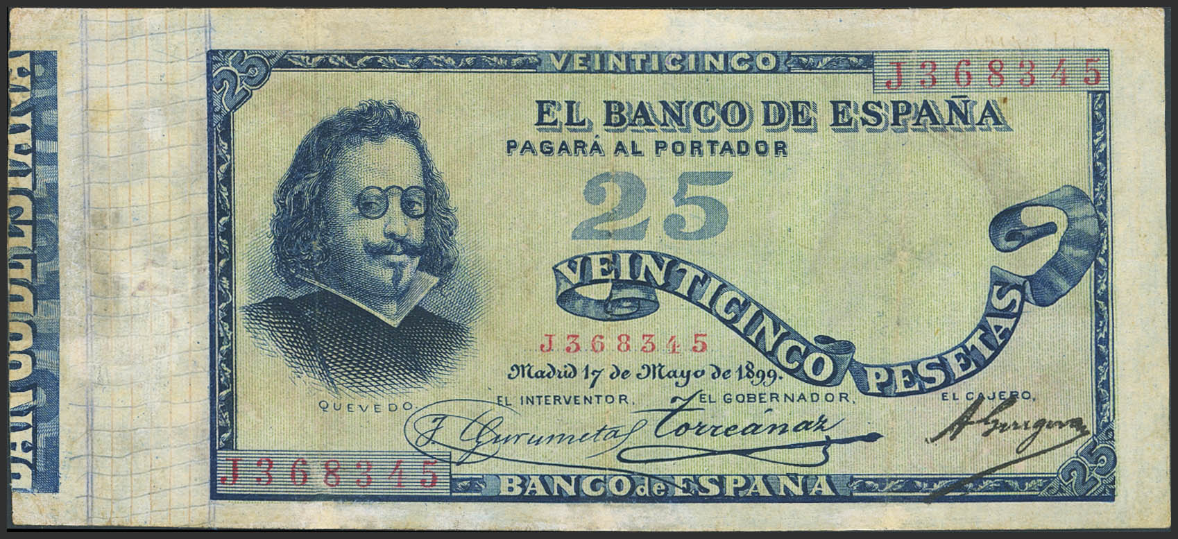 25 Pesetas. 17 de Mayo de 1899. Serie J. (Edifil 2023: 306a). Raro, reparado. MBC.