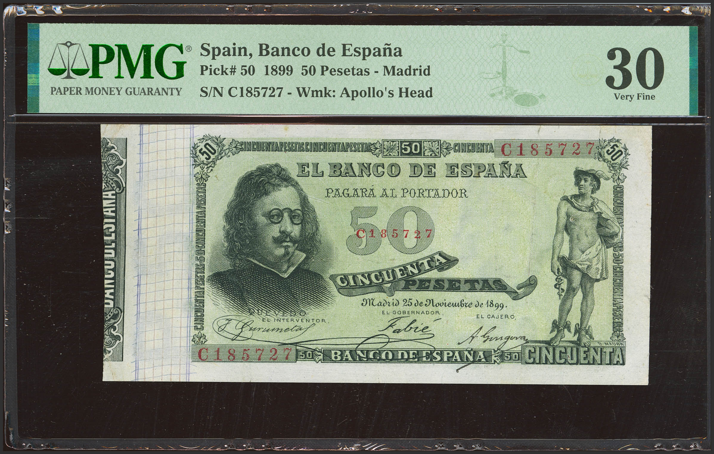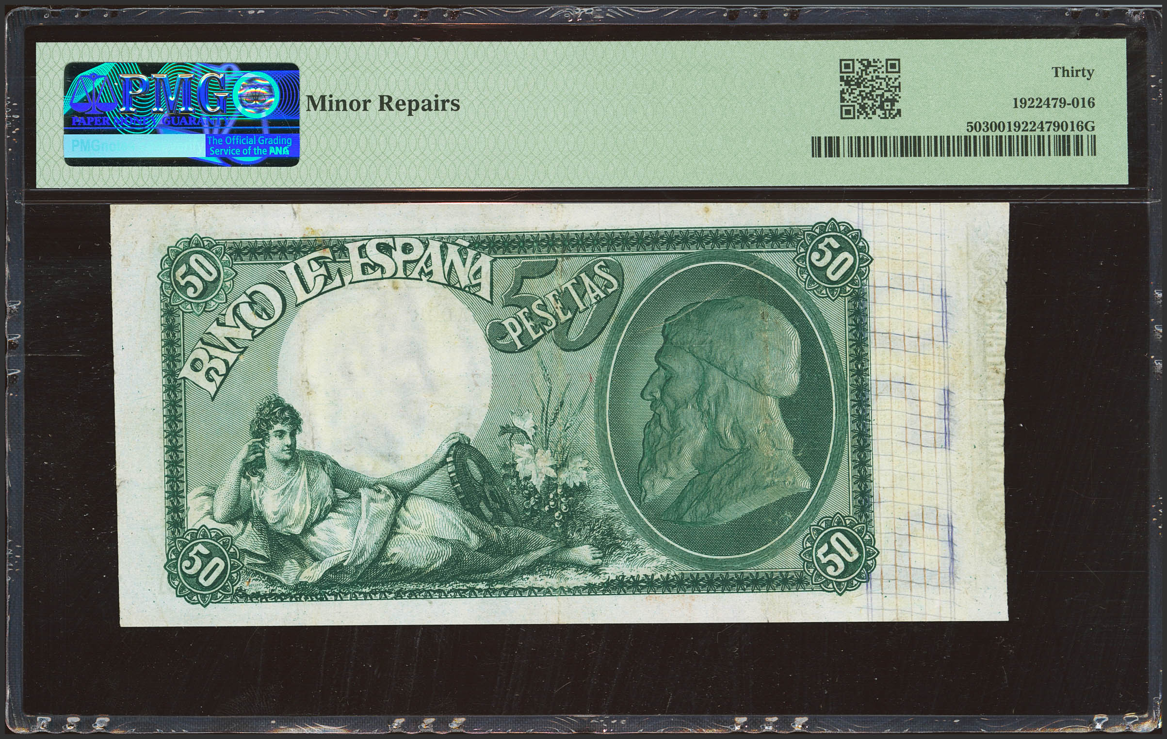 50 Pesetas. 25 de Noviembre de 1899. Serie C. (Edifil 2023: 307a, Pick: 50). Raro, mínimamente reparado. MBC+. Encapsulado PMG30 (minor repairs).
