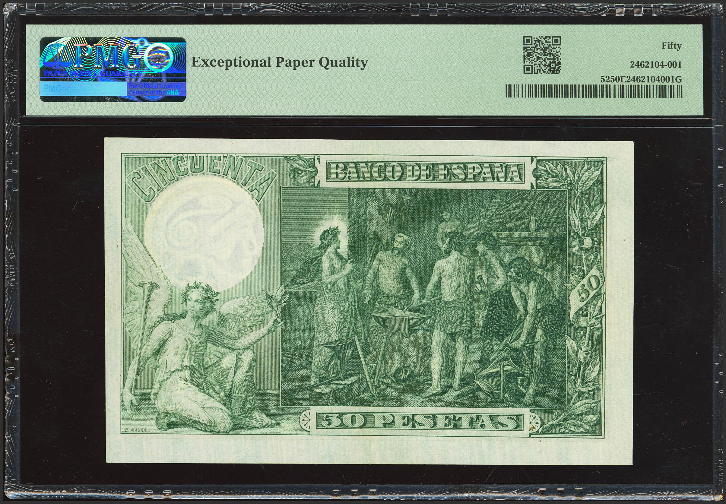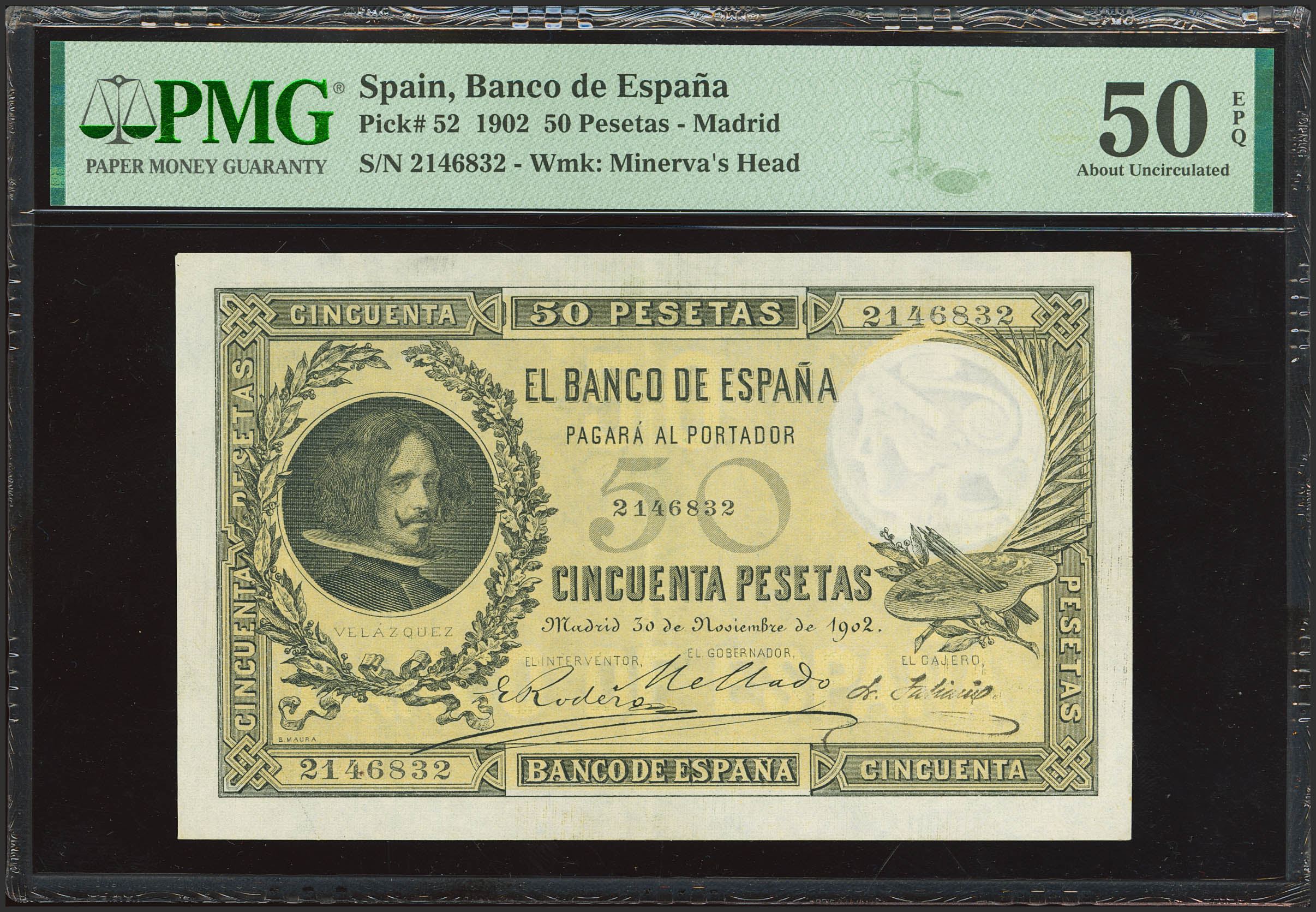 50 Pesetas. 30 de Noviembre de 1902. Sin serie. (Edifil 2023: 309, Pick: 52). Extraordinariamente raro, especialmente en esta excepcional calidad. EBC. Encapsulado PMG50EPQ (para hacernos idea de la rareza, a fecha 1 de Octubre de 2025, este billete es el quinto mejor calificado y el mejor calificado con EPQ en PMG)