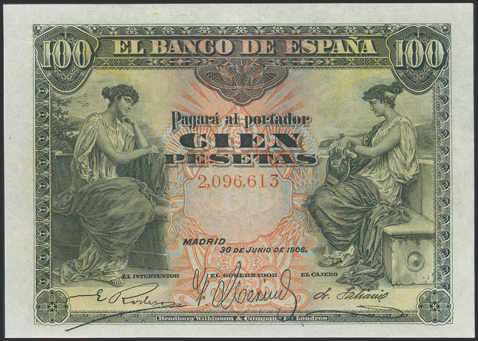 100 Pesetas. 30 de Junio de 1906. Sin serie. (Edifil 2023: 313). Inusual, apresto original. EBC++.