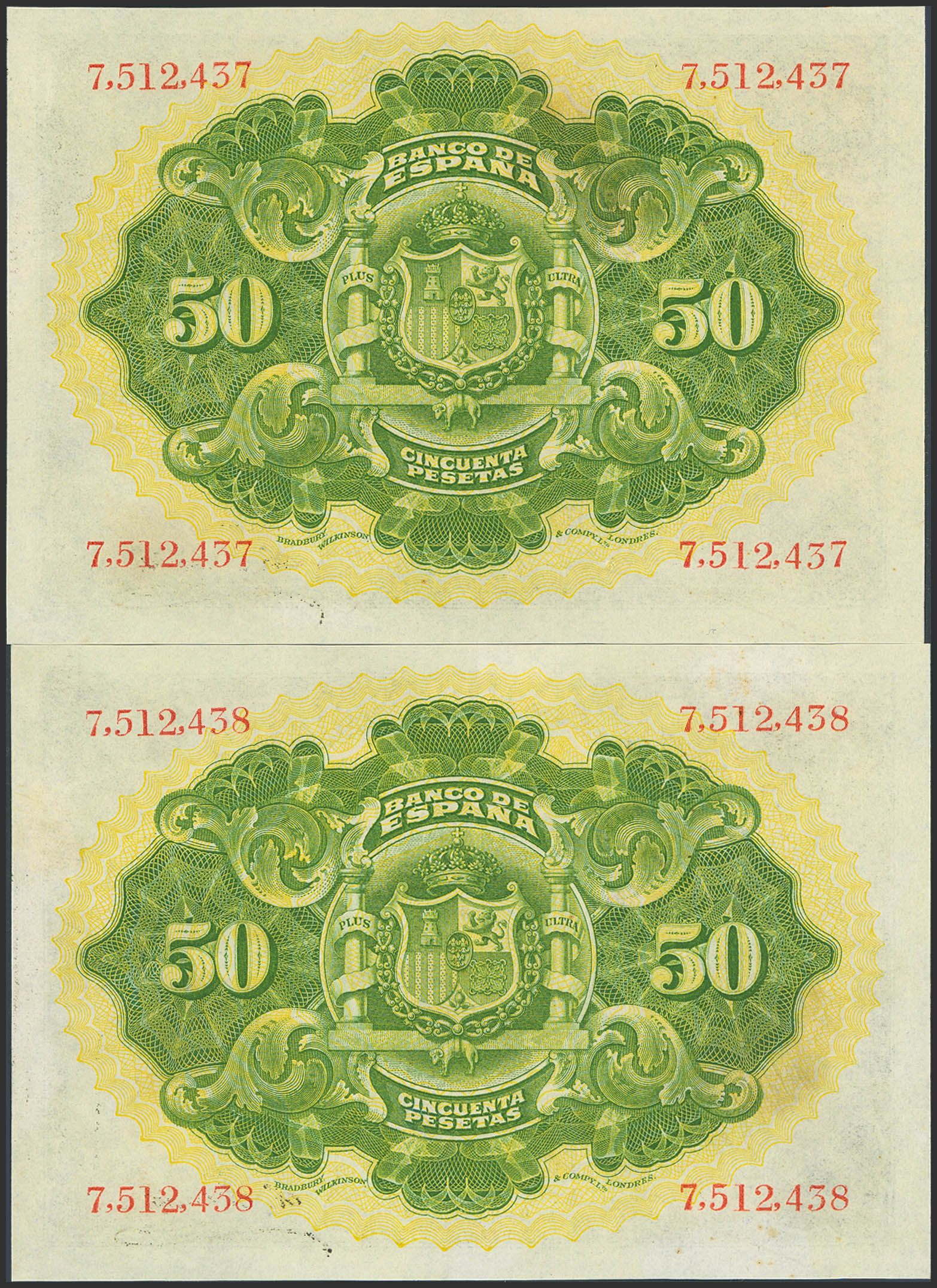 50 Pesetas. 24 de Septiembre de 1906. Pareja correlativa. Sin serie. (Edifil 2023: 315). Conserva gran parte de su apresto original. EBC.