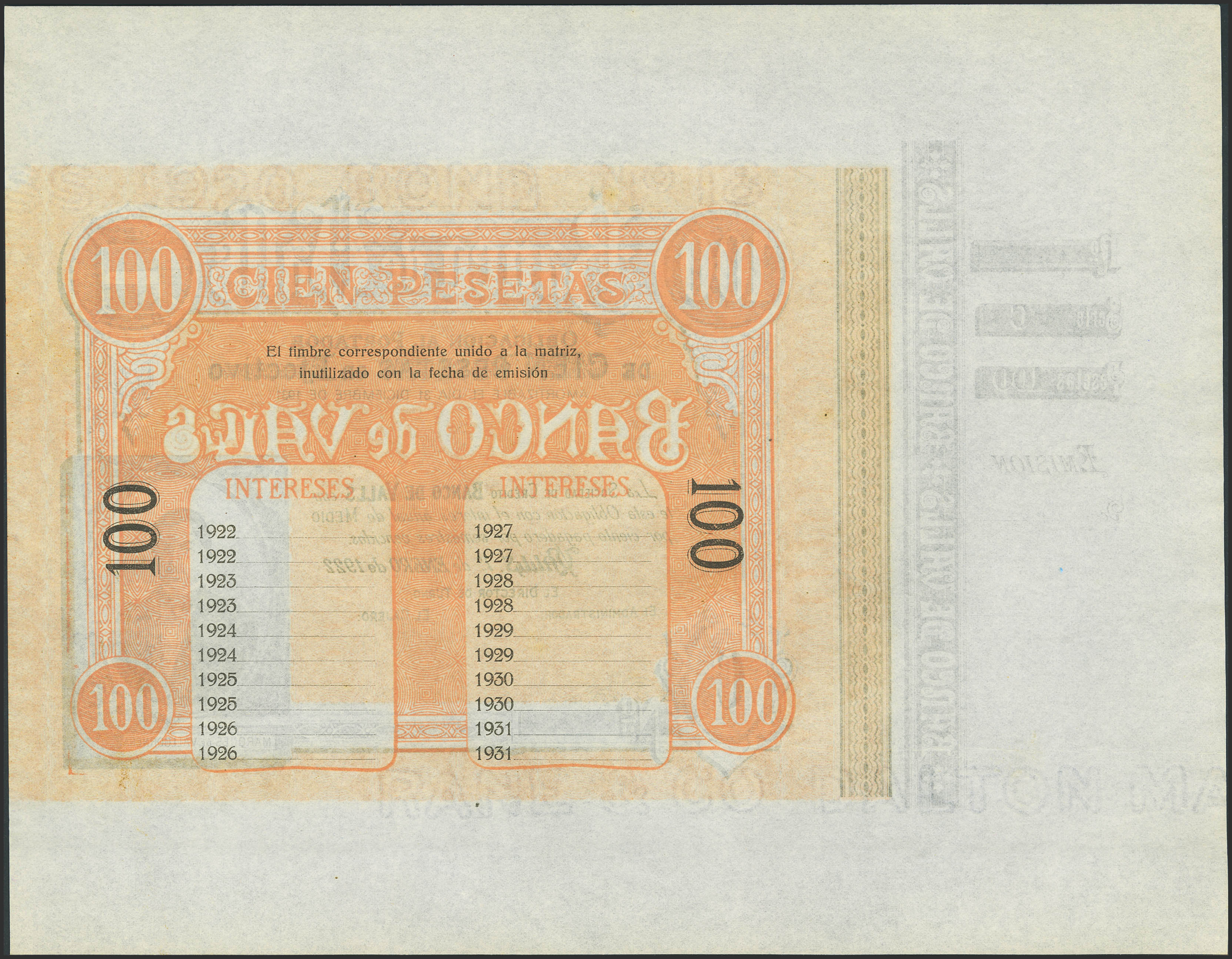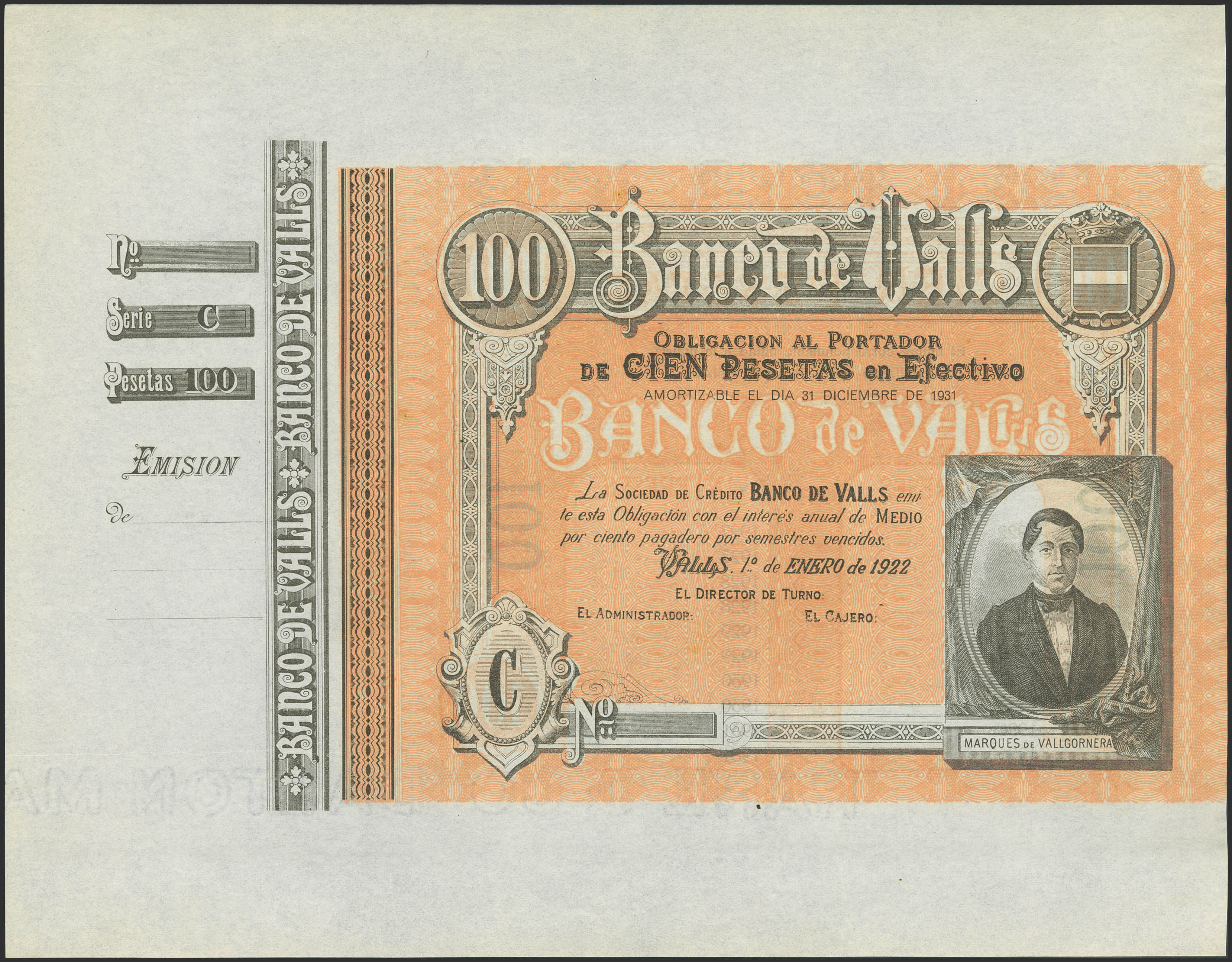 100 Pesetas. 1 de Enero de 1922. Banco de Valls. Sin numeración, sin firmas y con matriz. Serie C. (Ruiz y Alentorn: no listado). SC-.