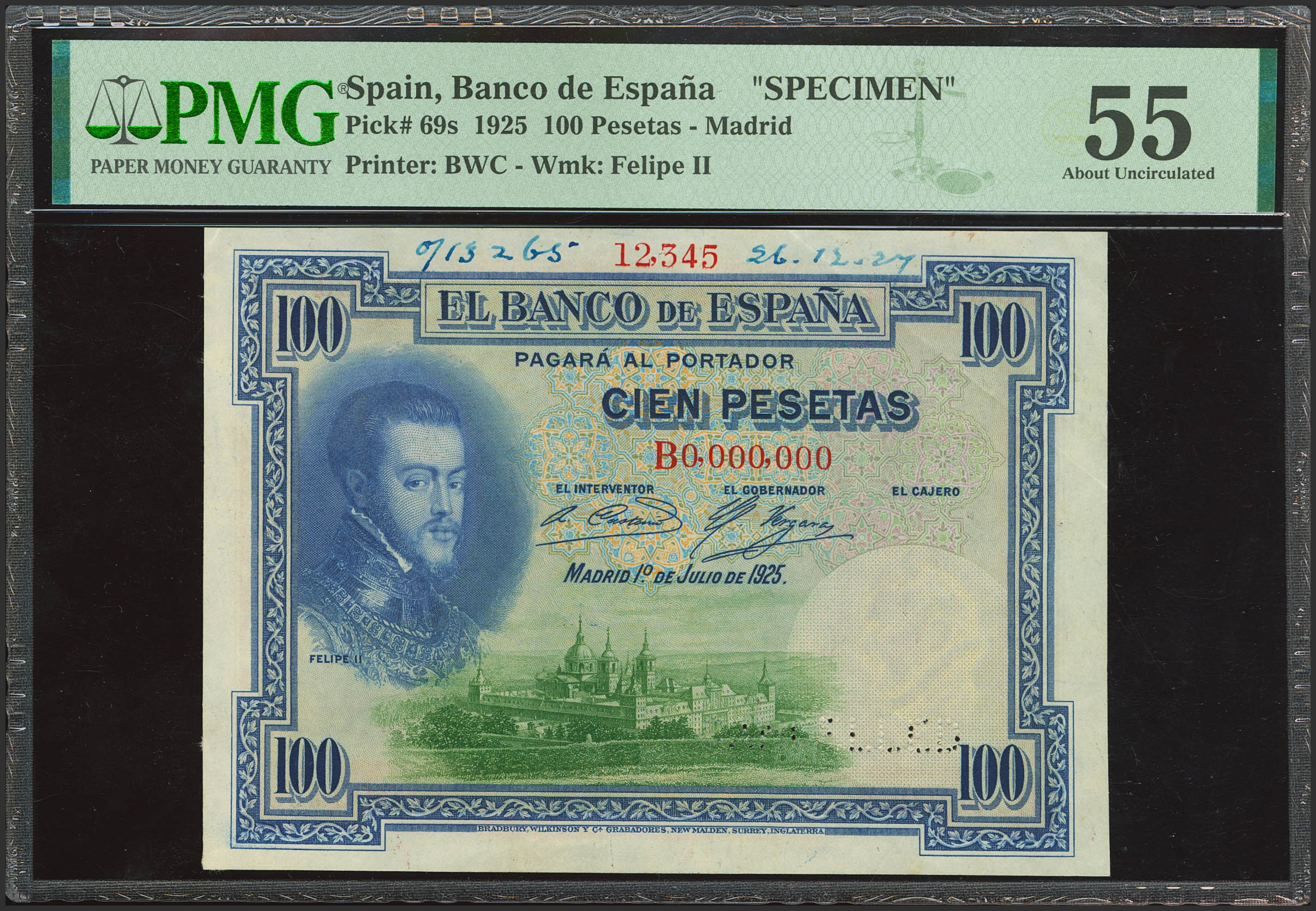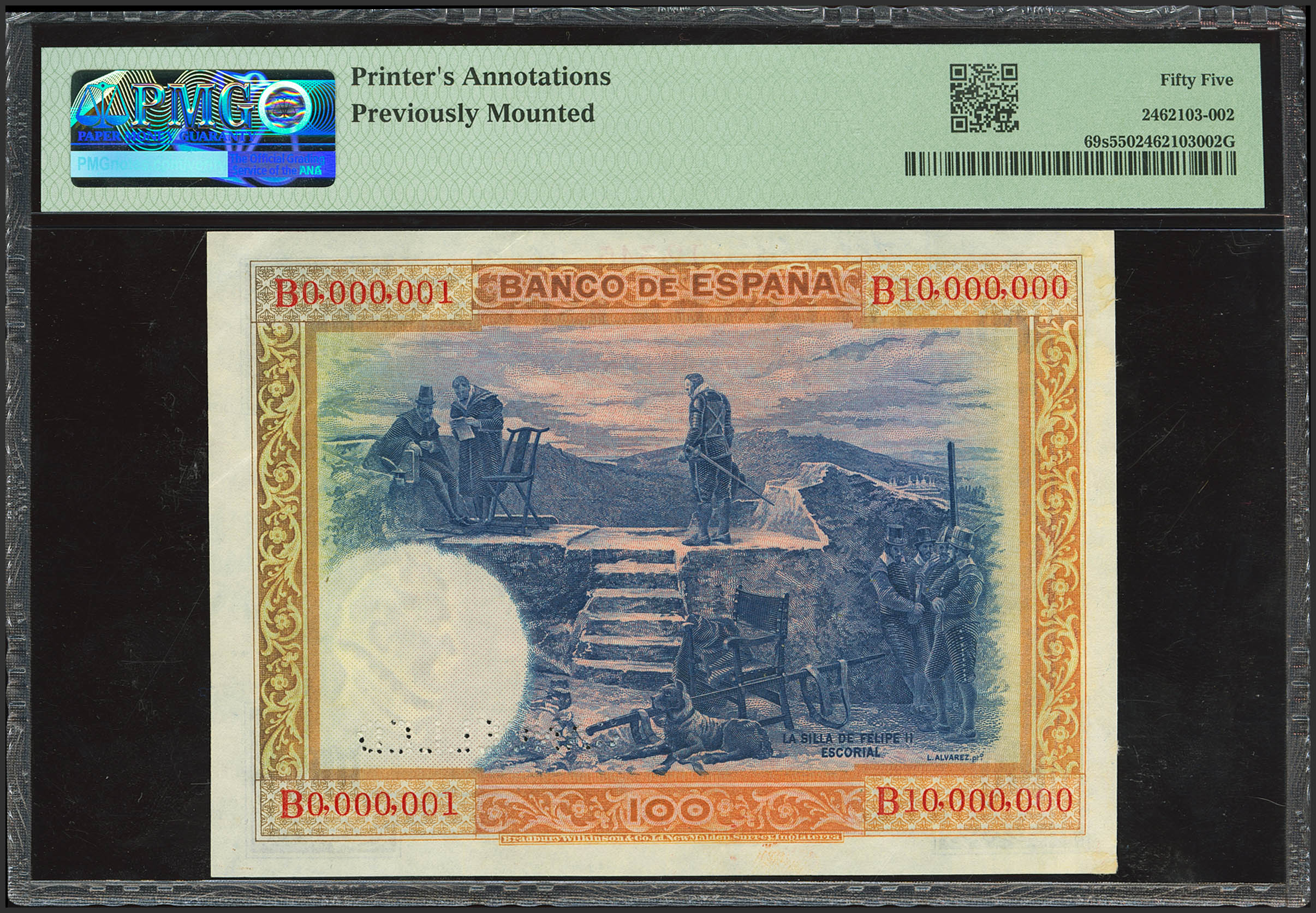 100 Pesetas. 1 de Julio de 1925. Serie B, sin la firma de cajero y taladrado SPECIMEN. (Edifil 2023: 323Ma, Pick: 69s, Filabo: 107md). Extraordinariamente raro. EBC+. Encapsulado PMG55 (previously mounted, printer´s annotations).