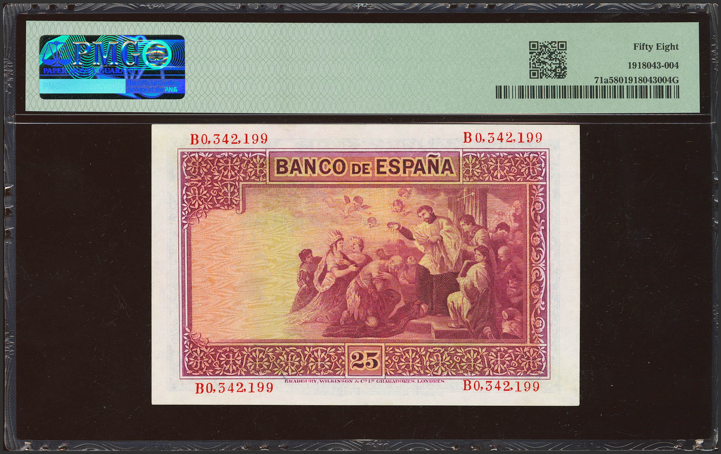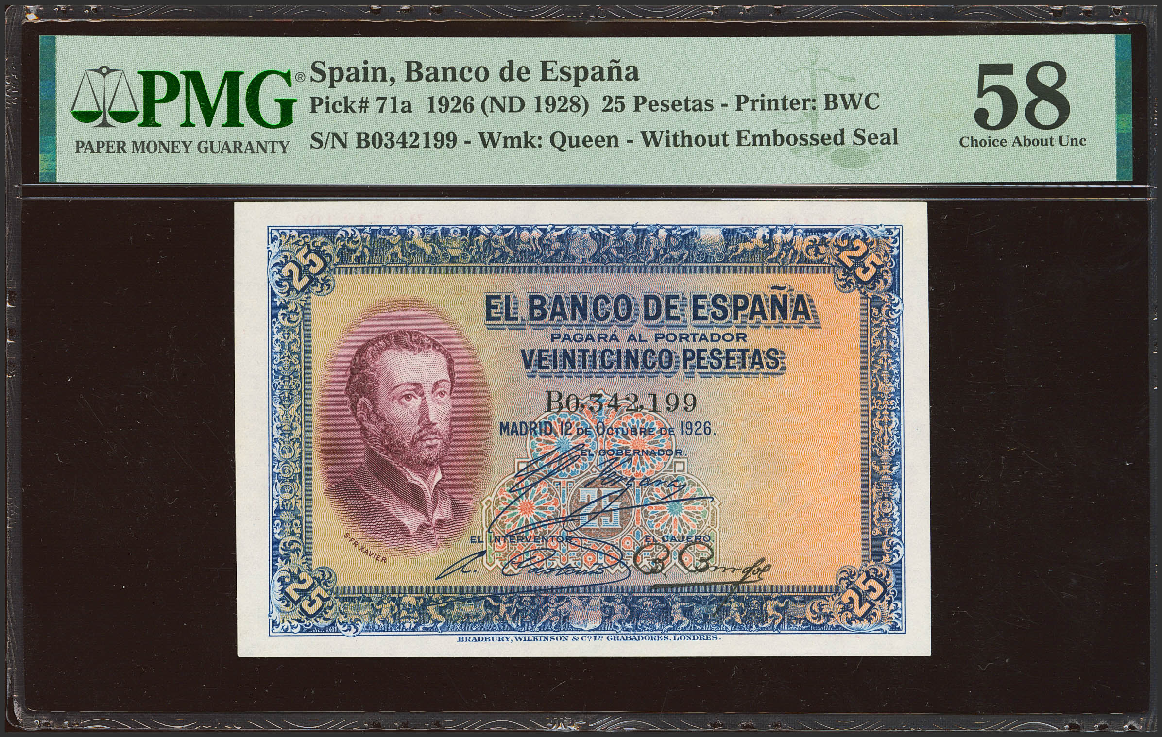25 Pesetas. 12 de Octubre de 1926. Serie B. (Edifil 2023: 325a, Pick: 71a). Inusual en esta calidad. EBC++. Encapsulado PMG58.