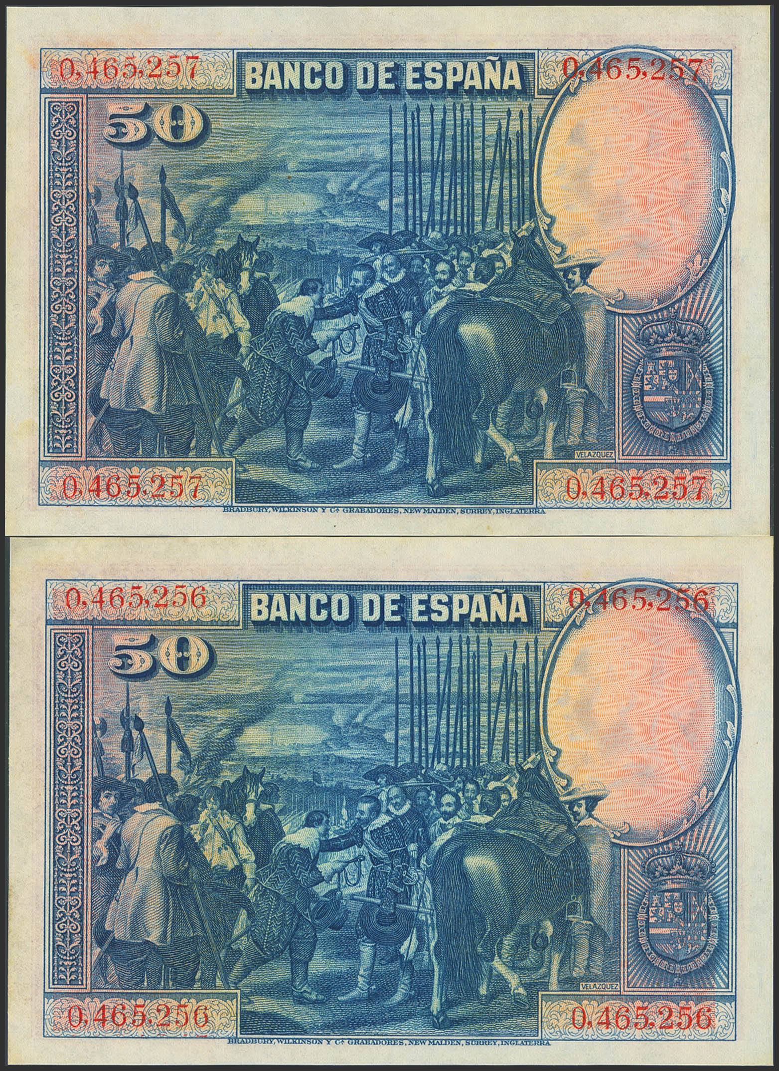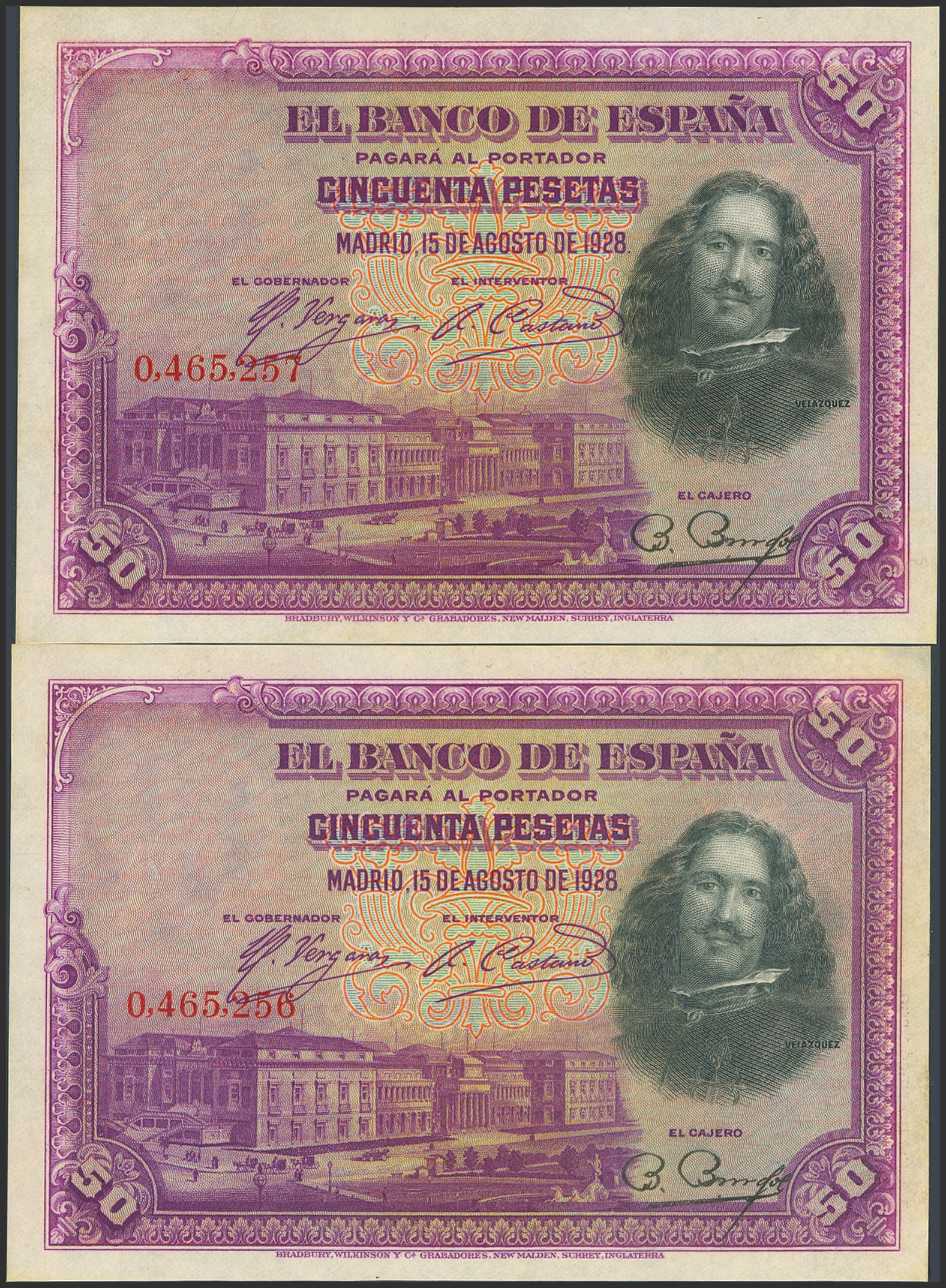 50 Pesetas. 15 de Agosto de 1928. Pareja correlativa. Sin serie. (Edifil 2023: 329). Inusual, conserva gran parte del apresto original. EBC+++.