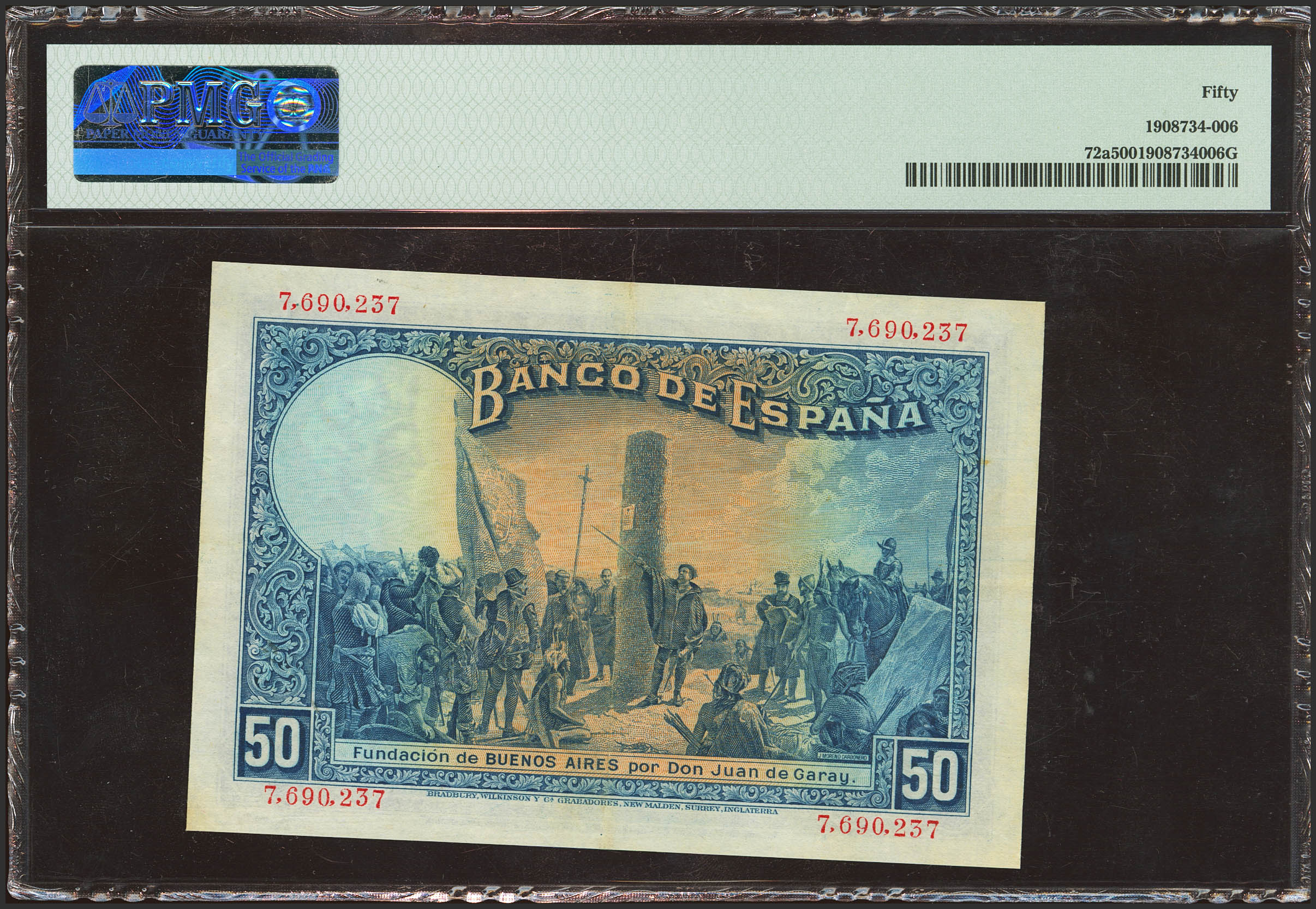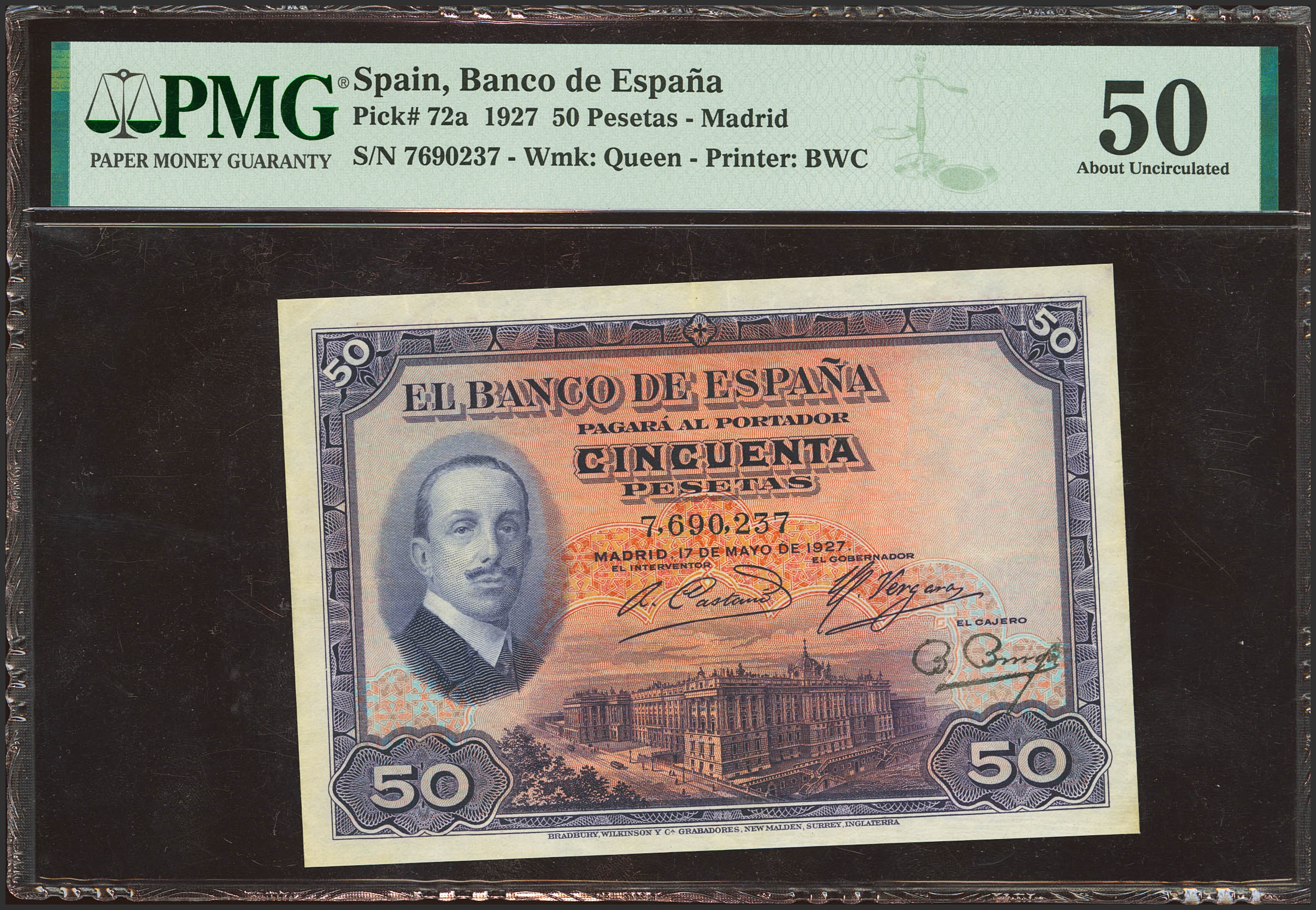 50 Pesetas. 17 de Mayo de 1927. Sin serie y sello en seco "Gobierno Provisional de la República / 14 Abril 1931". (Edifil 2021: 339, Pick: 72b). EBC. Encapsulado PMG50.