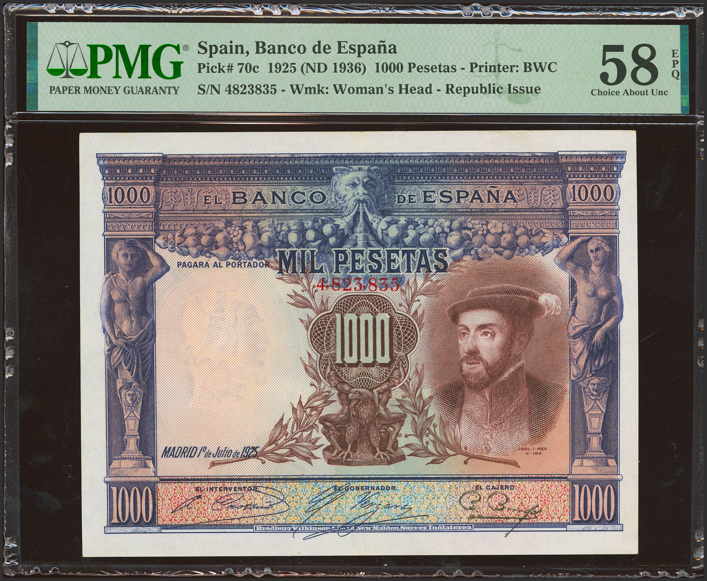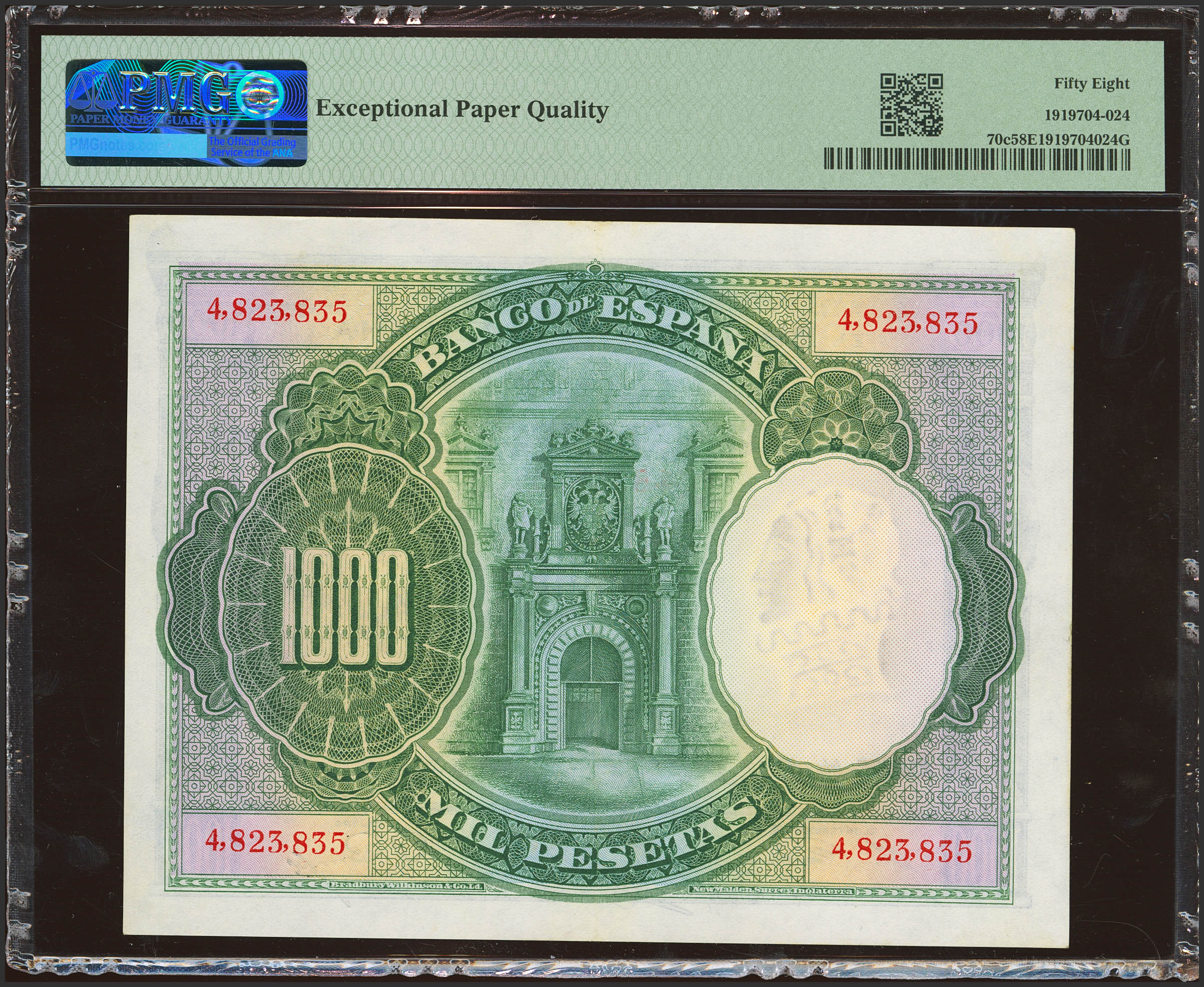 1000 Pesetas. 1 de Julio de 1925. Sin serie y numeración superior al 3646000. (Edifil 2023: 351, Pick: 70c). Inusual en esta calidad, apresto original. EBC+++. Encapsulado PMG58EPQ.