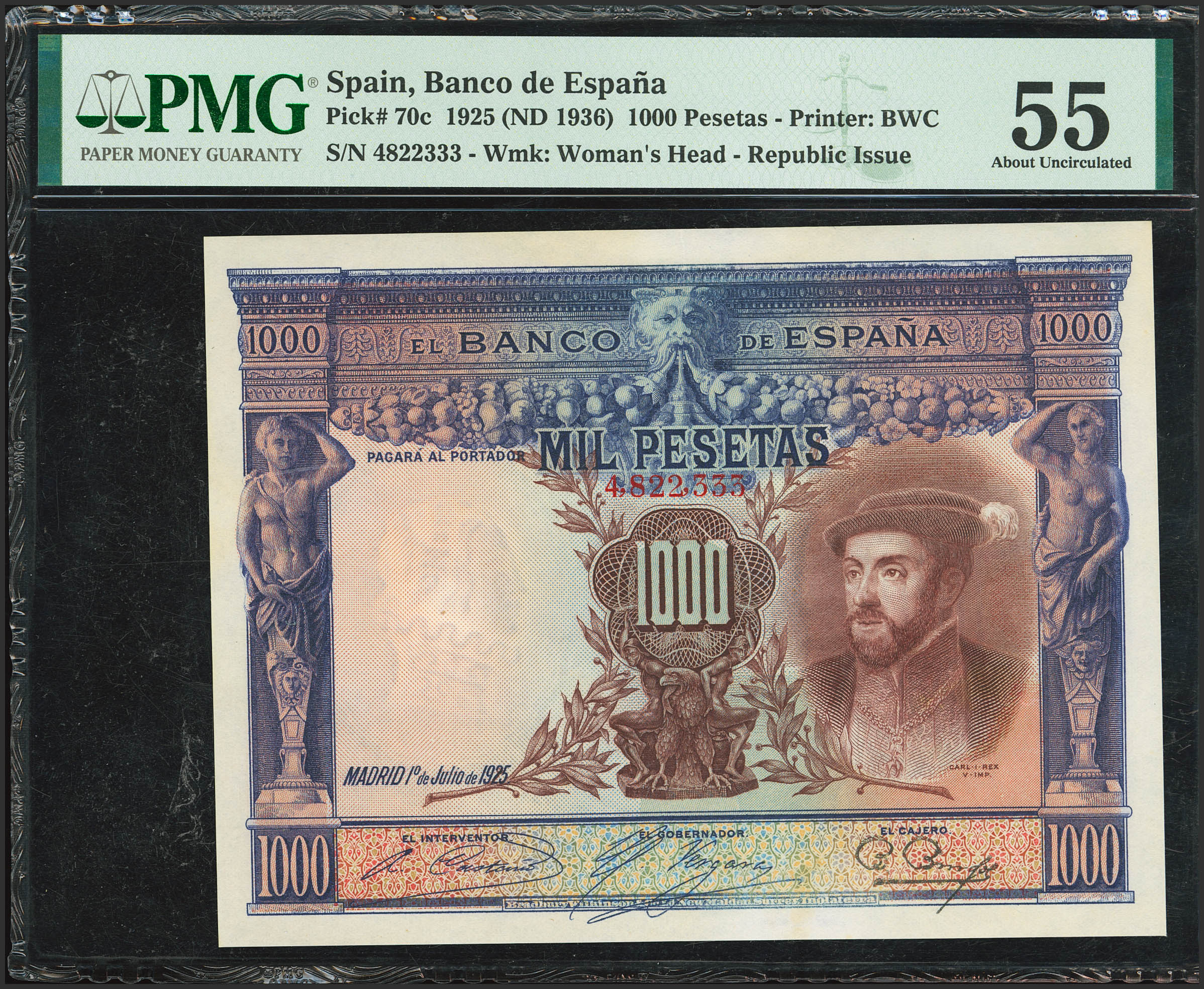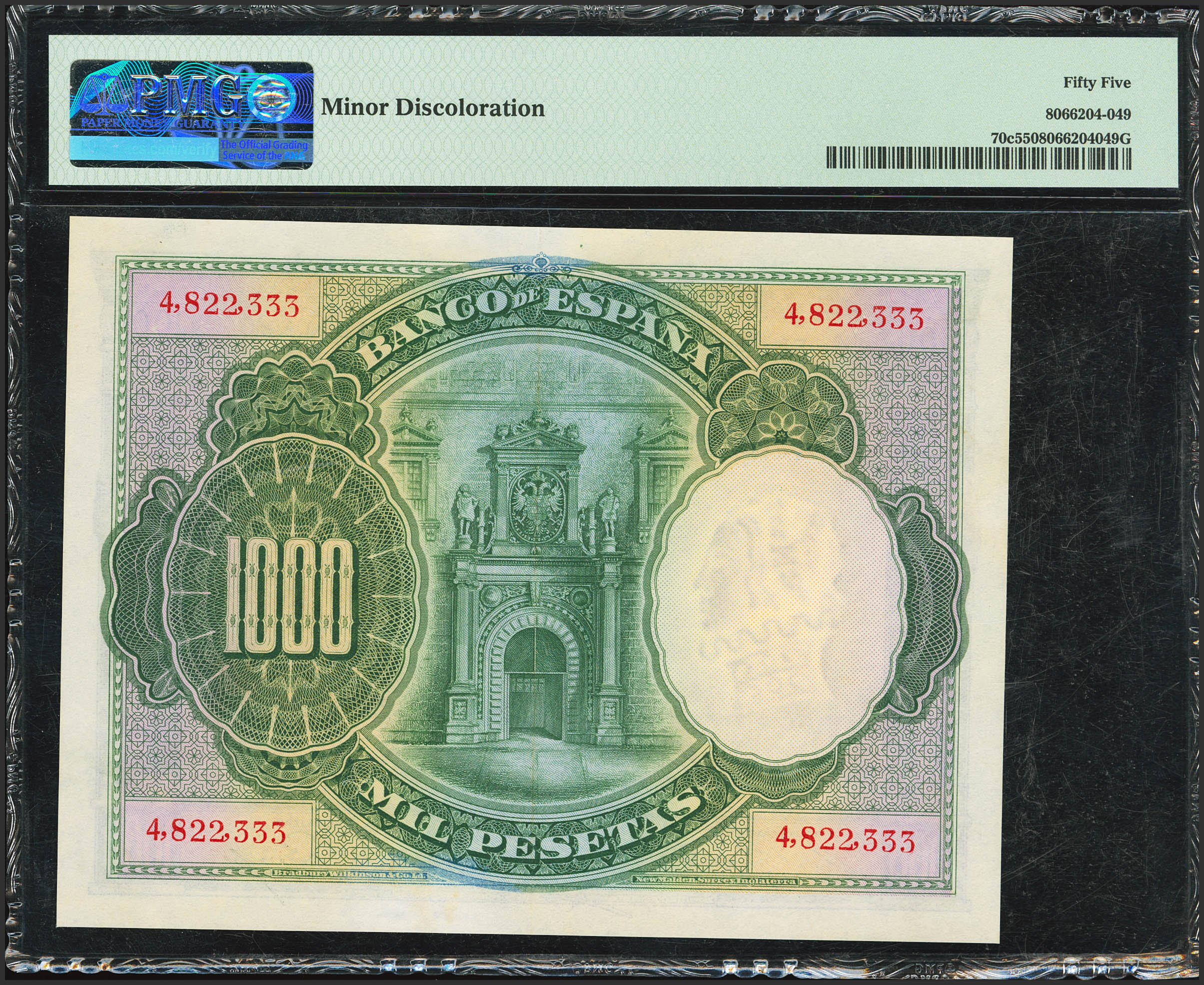 1000 Pesetas. 1 de Julio de 1925. Sin serie y numeración posterior al 3646000. (Edifil 2023: 351, Pick: 70c). Inusual en esta calidad. EBC+. Encapsulado PMG55 (minor discoloration).